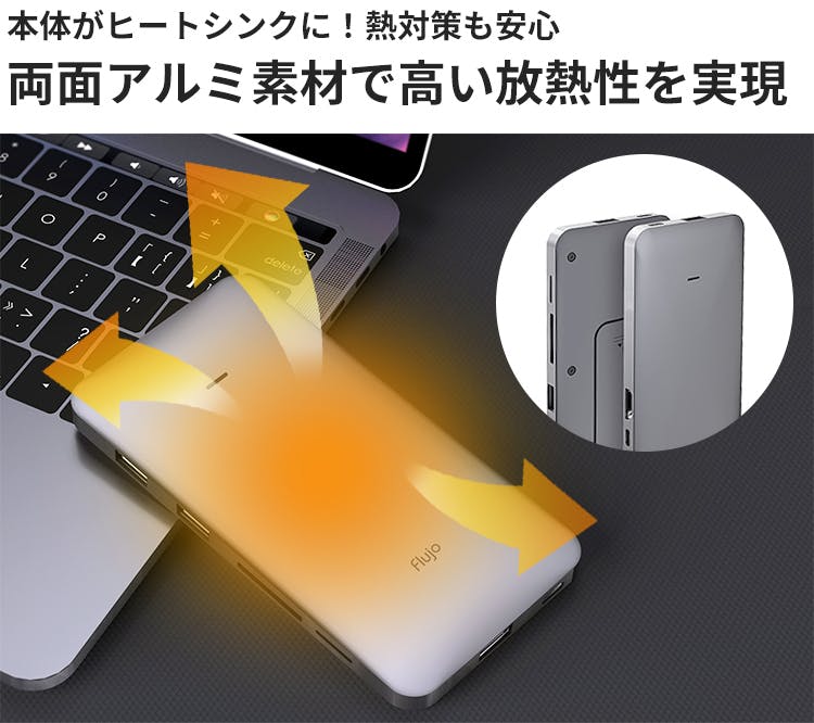 このような製品では、一般的に、片面アルミ素材の仕様が多いのですが、「Signature Pro」は、なんと両面ともにアルミ素材を採用しました。 これにより、放熱性がさらにアップ。本体がヒートシンクの役割をはたし、SSDに負担をかけにくい設計になっています。