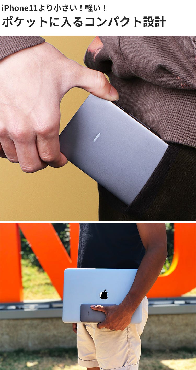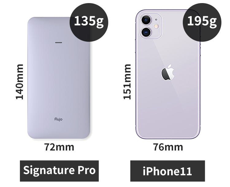 「Signature Pro」の魅力は、機能性だけではありません。持ち運び易さを考えた、コンパクト設計により、なんと、iPhone11よりも小さなサイズ&軽量を実現しました。ポケットにもすっぽり収まるサイズ感!