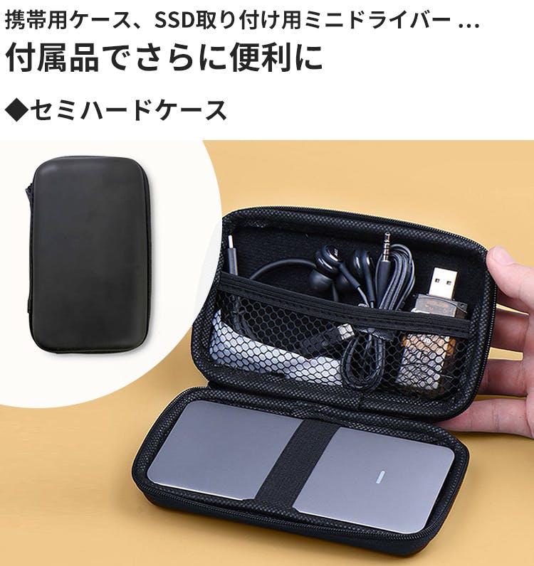 SSDカードを取り付けるためのミニドライバーも付属。付属のセミハードケースに収納可能です。