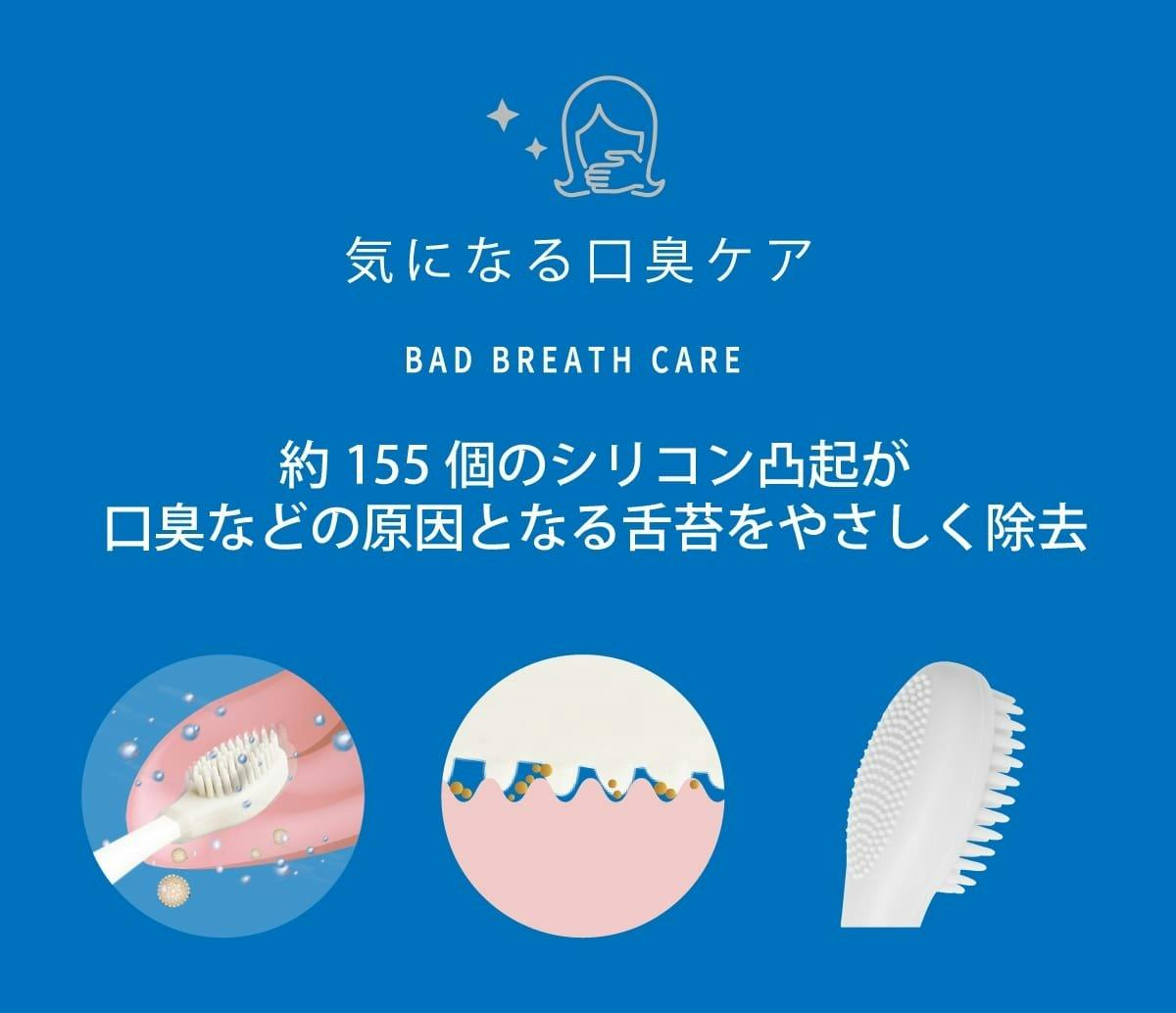 やさしいシリコン素材で約155個の凹凸部分が舌を傷つけず、口臭の原因となる舌苔を除去します。細やかな凹凸部分が舌に溜まった舌苔をしっかりかき出します。