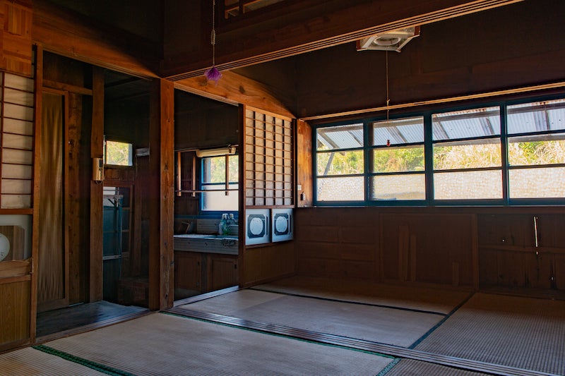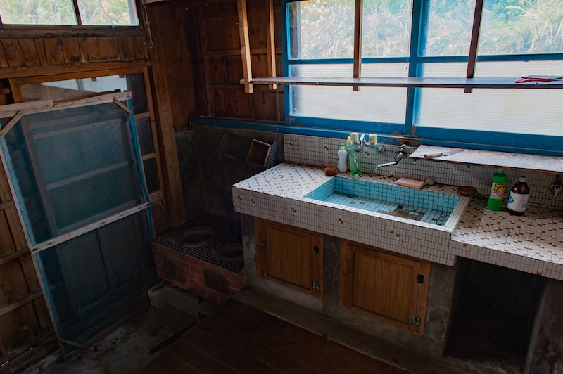 改修しようとしている空き家は、築60年以上は経過している古民家です。古民家の中では特に古い方ではありませんが、ほとんどリフォームされていないので、カマドやタイル張りの流し台、古い建具が残っています。特に窓にはアルミサッシが一切使われていません。この家の第一の魅力は、空色に塗られた木枠の窓だと感じています。