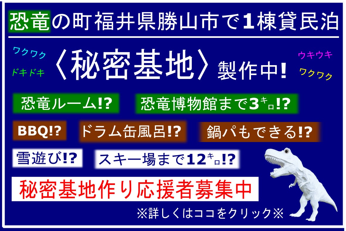 #民泊#福井#勝山#恐竜博物館#ジャム勝#スキージャム勝山#越前そば#スキージャム#恐竜ルーム#ドラム缶風呂#Airbnb#宿泊#gotoトラベル#ソースカツ丼#ジャム勝#ホワイトサウルス#民宿#旅館#BBQ#貸切#九頭竜川 #福井県#勝山市#福井ラプトル#恐竜渓谷#和室#一棟貸し#ゲストハウス#BBQ#秘密基地