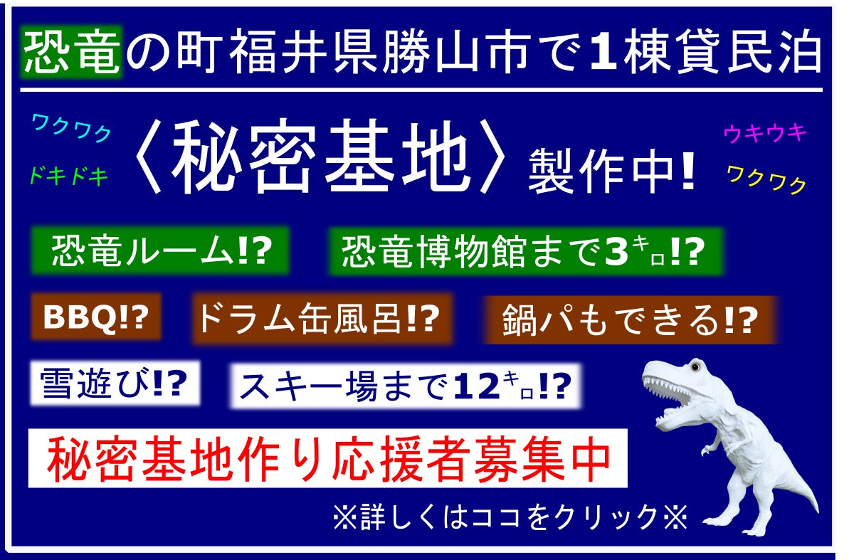 #民泊#福井#勝山#恐竜博物館#ジャム勝#スキージャム勝山#越前そば#スキージャム#恐竜ルーム#ドラム缶風呂#Airbnb#宿泊#gotoトラベル#ソースカツ丼#ジャム勝#ホワイトサウルス#民宿#旅館#BBQ#貸切#九頭竜川 #福井県#勝山市#福井ラプトル#恐竜渓谷#和室#一棟貸し#ゲストハウス#BBQ#秘密基地