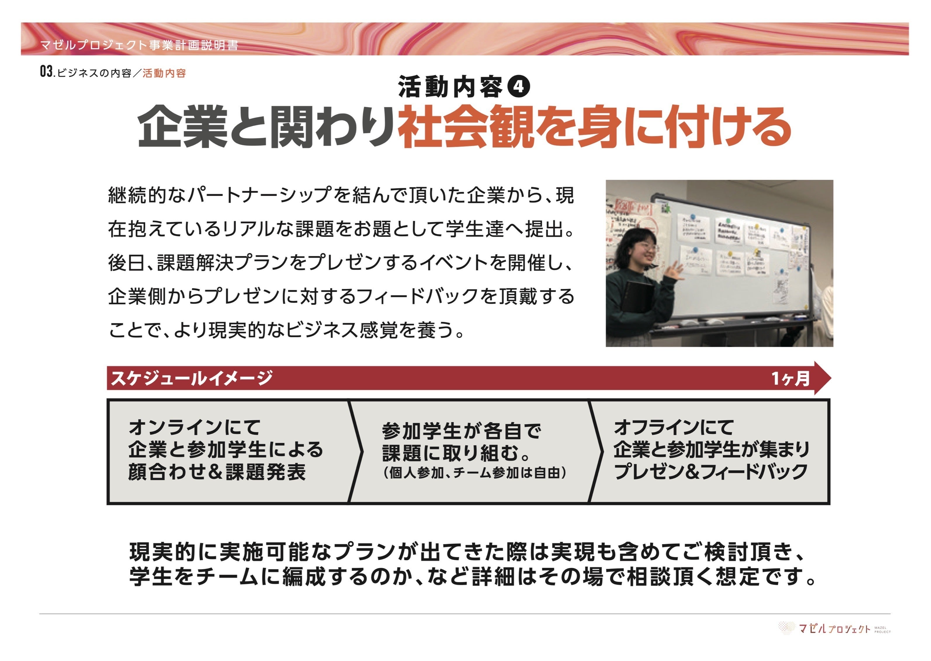 マゼルプロジェクトの具体的な取り組みは、「考える力」と「行動する力」の2つの力を身に付ける4つの企画を実践しています。