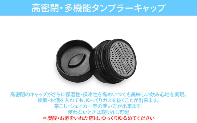 タンブラーに関しては、気密性がボトルより低いため、振動により蓋のパッキン部分より、 炭酸ガスとともに液体が噴き出す可能性がございます。タンブラーで蓋をされる場合は、多少炭酸が抜けてから蓋を閉めて頂きますようお願いいたします。極度の振動を与えると蓋が飛ぶ危険性もございますので、ご注意願います。