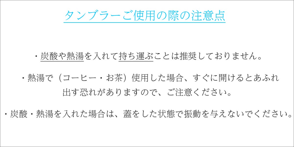 タンブラーは炭酸・お酒・お湯などを入れた際の持ち運びは推奨しておりません。