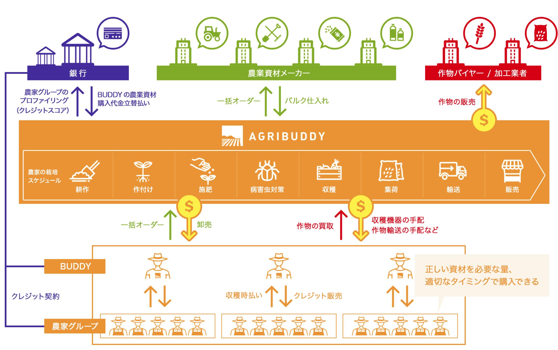 そこでAgribuddyは「Buddyを中心とした草の根ネットワーク」と「農家のデータ」を駆使し以下の方法で農家を支援しようと考えています。