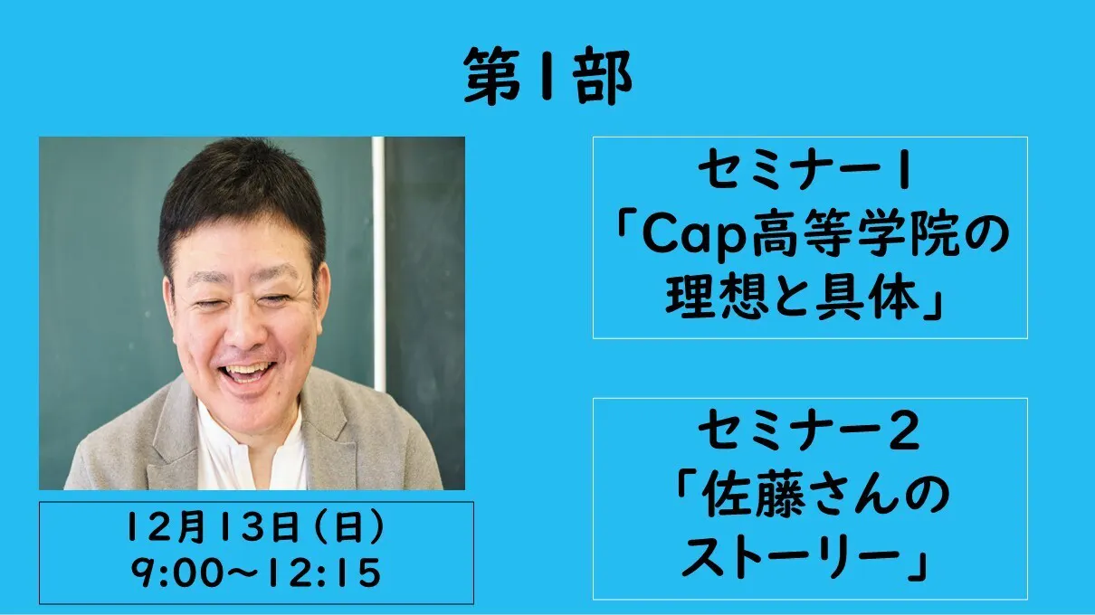 第1部では、CAP高等学院の理想と具体的な取組(セミナー1)、佐藤さんの教育への熱い想い(セミナー2)をお話していただきます。