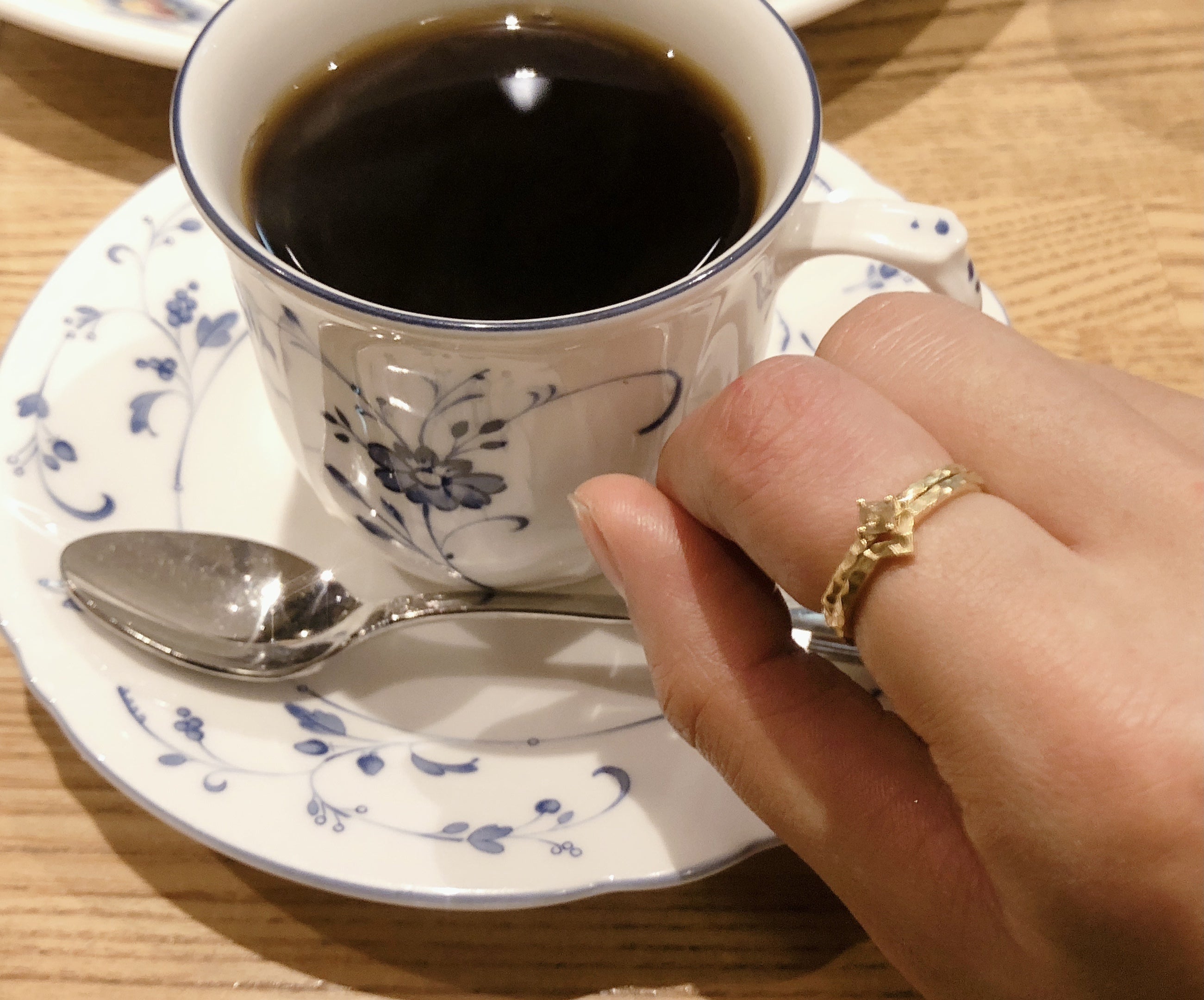 アンシェント ハンマード リング♩製作途中、叩きっぱなしの風合いを出すのが難しかったのですが、こんなふうに、カジュアルなコーデにも、フォーマルなコーデにも合うリングとなりました(^^)手元のリングと目が合うたび、ドキドキ、カフェでのミーティングも気分があがってしまいます♩