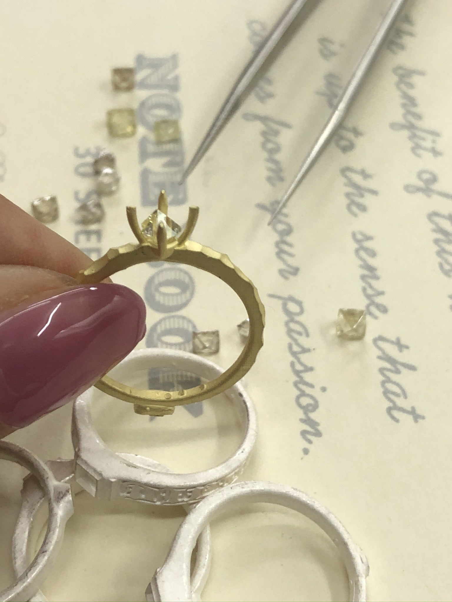 写真は、金で吹いたリングにダイヤモンド原石を合わせているところです。ダイヤモンドが微妙に大きすぎたり、小さすぎたり、なかなかぴったりあうダイヤモンドが見つかりません...これも原石だからこそ!世の中に出回りにくい上に、ラウンドのダイヤモンドと違って作るのが難しいから、このデザインのリングは世の中に出回らないんです。その、オーダージュエリーの分野のダイヤモンドリングをCAMPFIREを通して知ってもらえたら嬉しいです( ^ω^ )