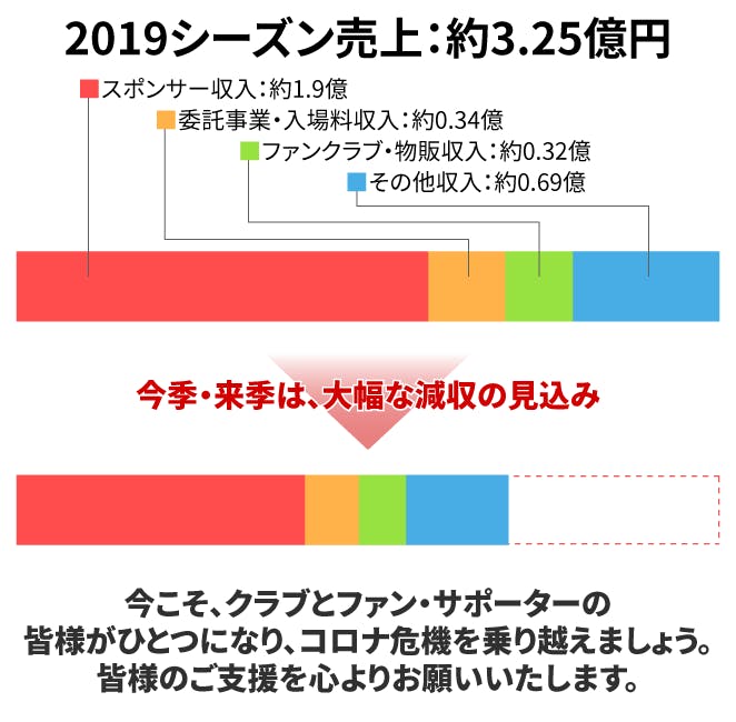 しかしながら、新型コロナウイルス感染症拡大によるJ3開幕の延期をはじめ、ホームゲーム入場者の制限や地域でのふれあい活動の自粛、社会情勢の悪化によるスポンサーの撤退など、これまで体験したことのない大幅な収入減により運営資金の目途が立っておらず、経営危機に陥っています。