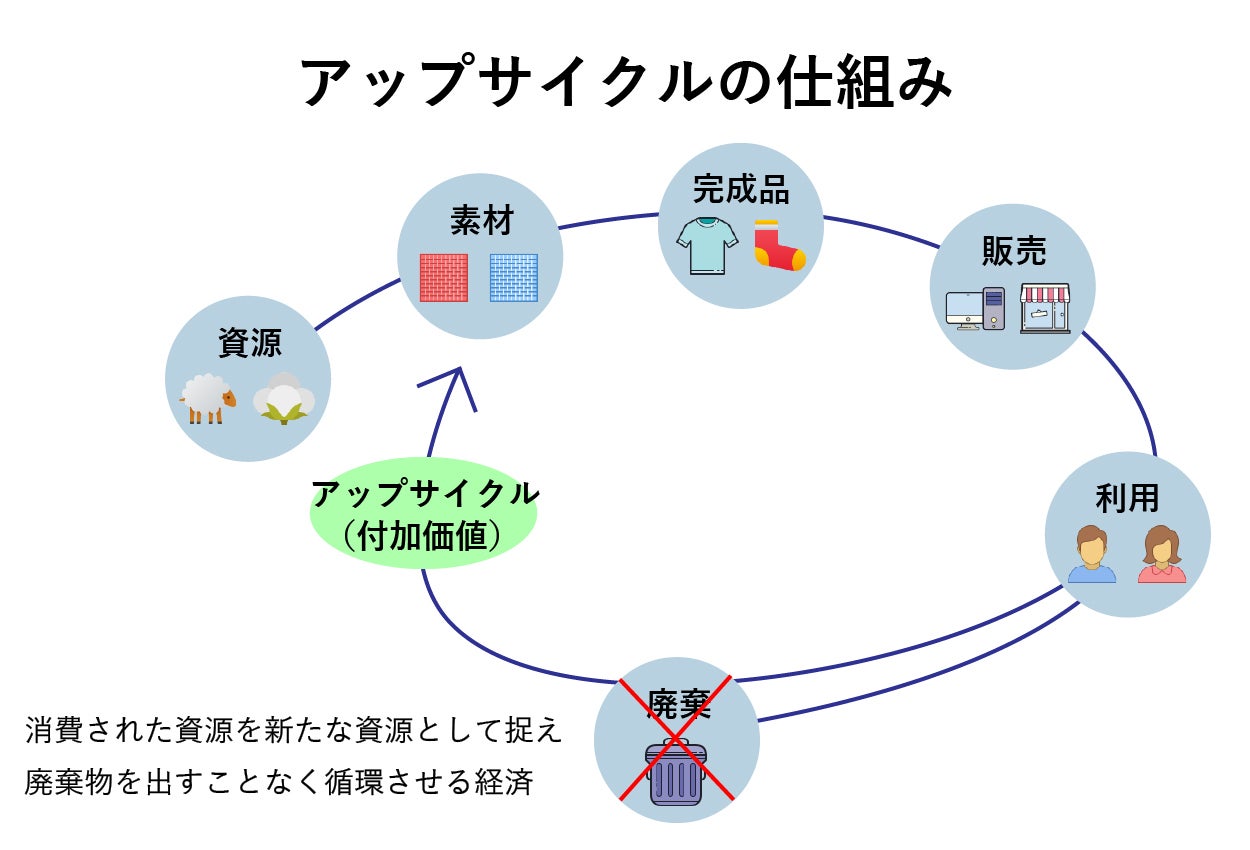 アップサイクルでは利用した後にその商品に付加価値を与えて再構成し、新たなモノとして生まれ変わらせます。