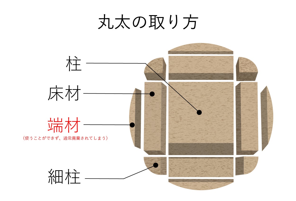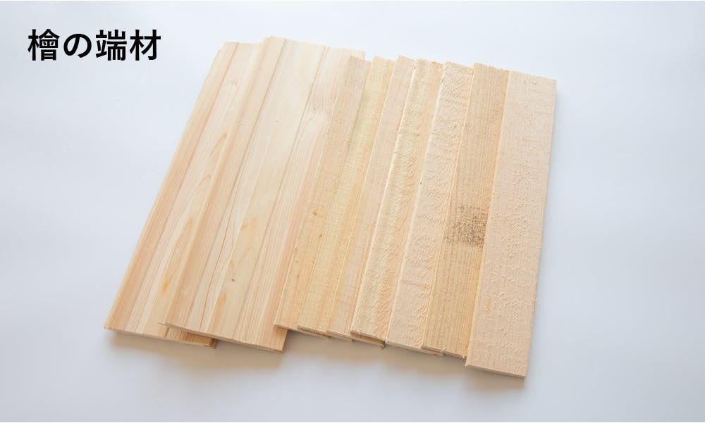 端材とは丸太の木取りを行った際に残った利用されることがない部分のことを言います。 この部分は素材として使うことができないくらい小さく薄いため一般的には捨てられてしまいます。 大醐ではこの部分をいただいて、ドアオープナーを作ることにしました。
