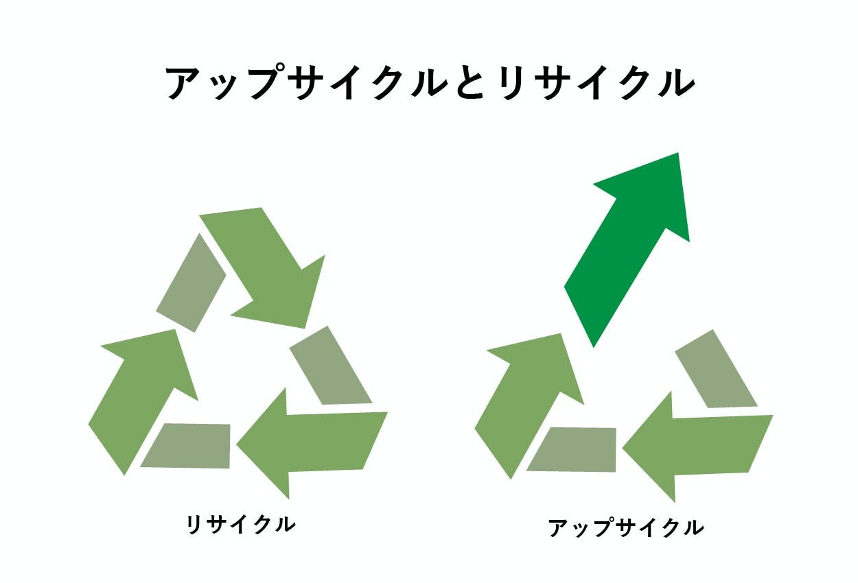Upcycle(アップサイクル)とはリユースやリサイクルとは別の考え方で、廃棄物や使えなくなった物に付加価値を付け、新しいモノとして生まれ変わらせることをいいます。