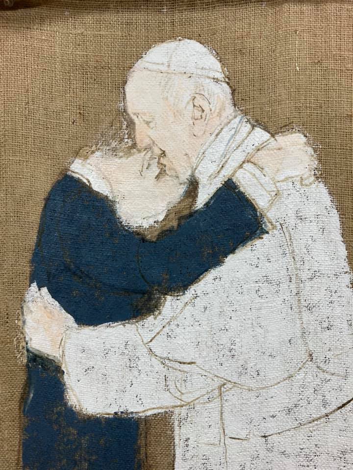 (タイトル画像は画家・小林憲明さんがもやい展2021東京出展用に製作途中の鴨下さんとローマ教皇との抱擁の絵画です)