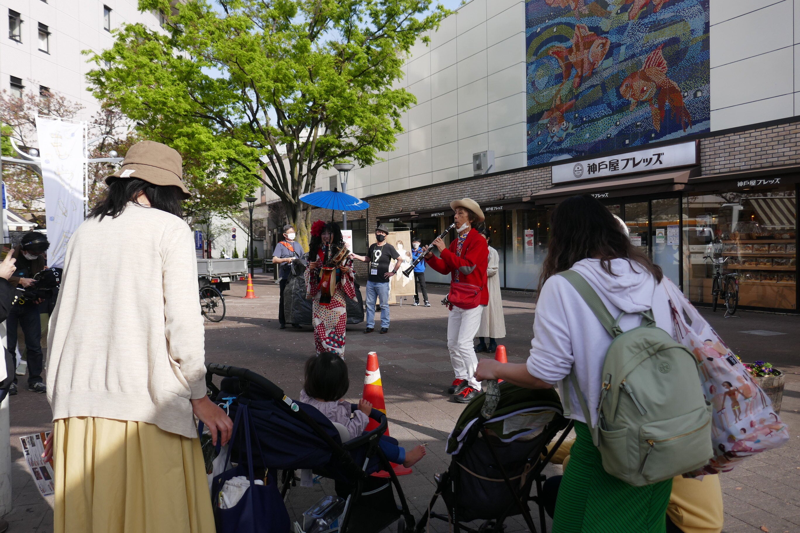 4月1日、もやい展の開幕を祝し、船堀駅前で流しと展示室ライブを行ったジンタらムータ。船堀駅を練り歩くチンドン楽団と歩くフレコンバックに母子像の幟(小林憲明画)などに、道ゆく人は思わず足を止め、軽快な音楽に笑みがこぼれる。