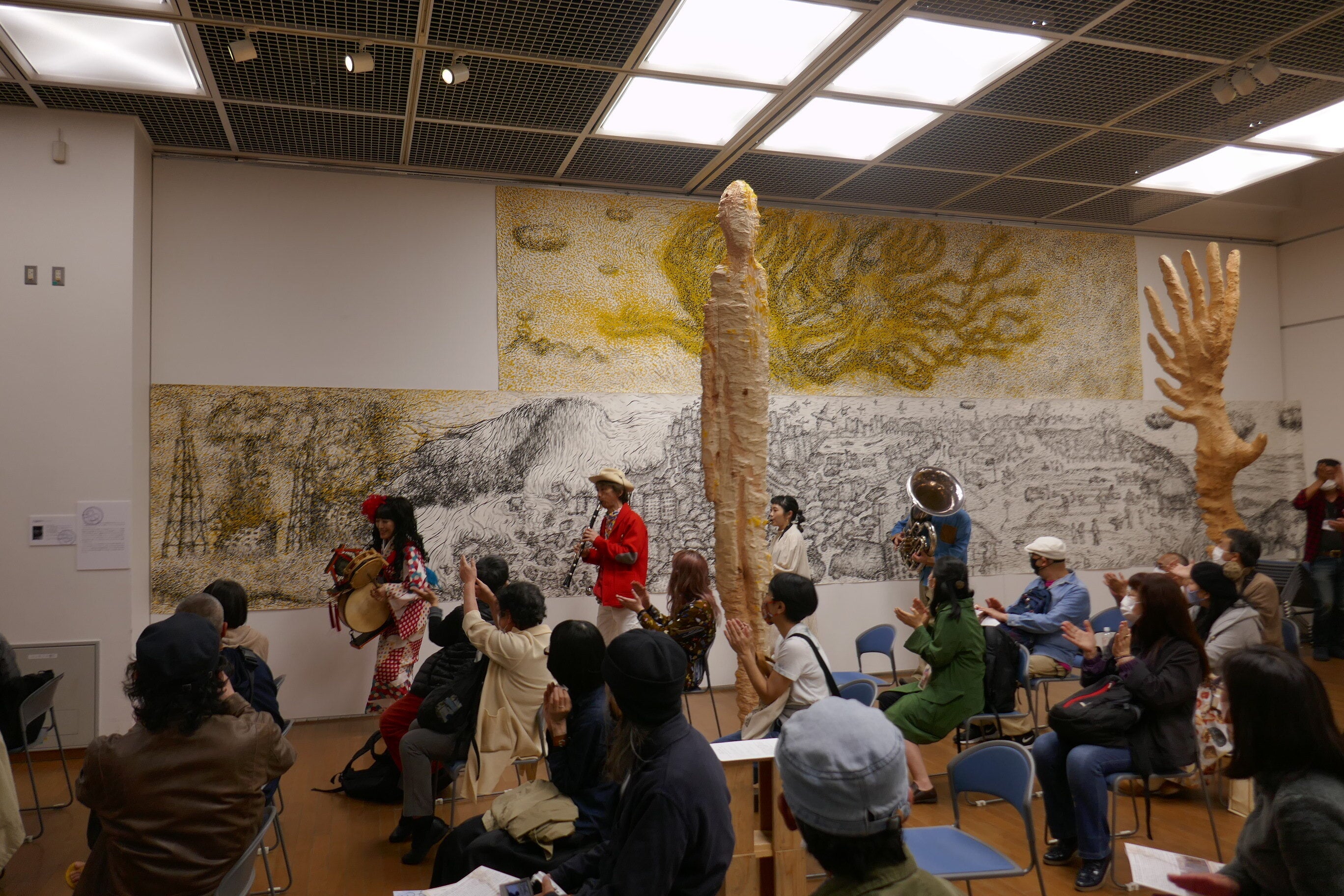 ビクトル・ハラが50年前、ベトナム戦争に反対し世界に歌いかけた「静かに暮らし 生きる権利を〜」(中川敬訳)をみわぞうが真摯にうたい上げ、もやい展に深々と共鳴する。原発事故を忘れない、というもやい展の表現意思と、汚染水海洋放出まで決められた福島の人々、虐殺に苦しめられているミャンマーの人々など、現在もなお不条理に苛まれる人々へ通じるうたとして、「平和に生きる権利」は今とても大切なうただ。