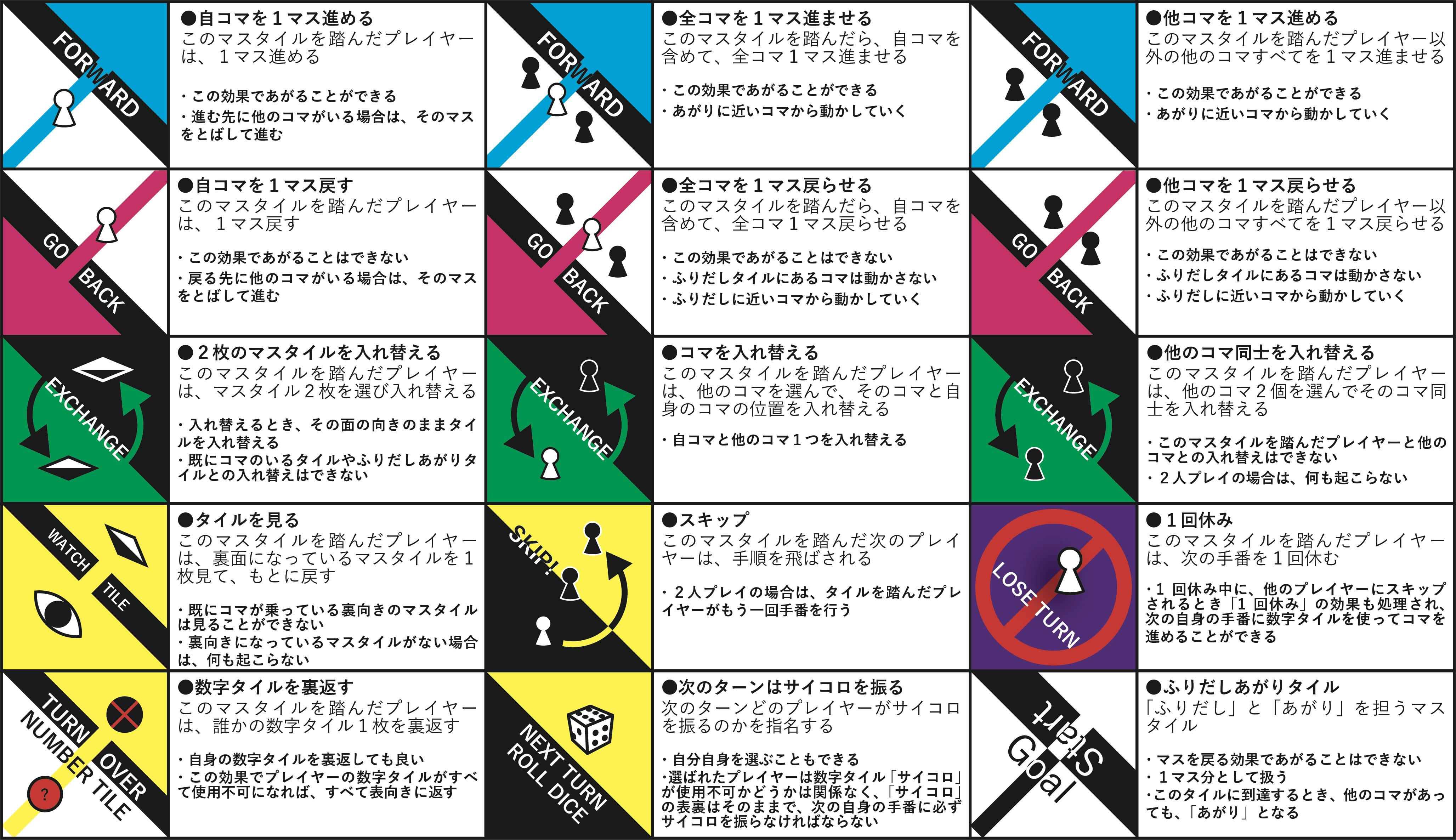 背景が青色→前進マス、赤色→後退マス、緑色→交換マス、黄色→特殊マス、紫色→休止マス