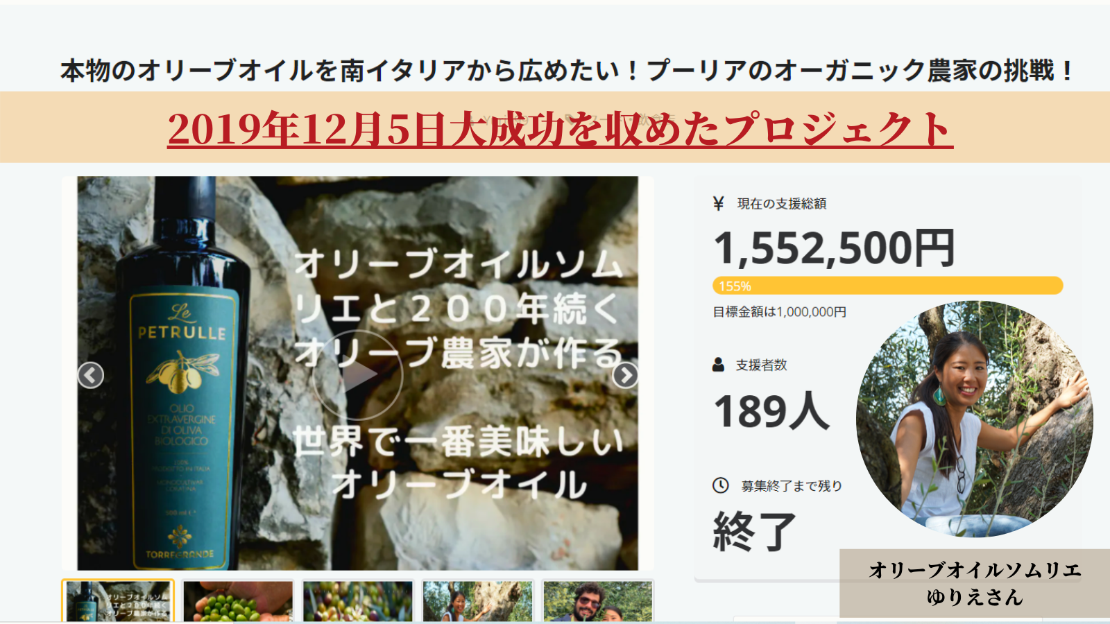 イタリアで活躍中の日本人オリーブオイルソムリエのゆりえ(足立友里絵)さんが現地イタリアで本気でオリーブオイルを作り、世界へ伝えていく。この活動が1年前にCAMPFIREで始動し、プロジェクトは大成功。ところがその後訪れたのがコロナウィルスの蔓延。商品の良さを伝えるための絶好のチャンスである「見本市」は、世界ではもちろん、日本でも中止を余儀なくされました。
