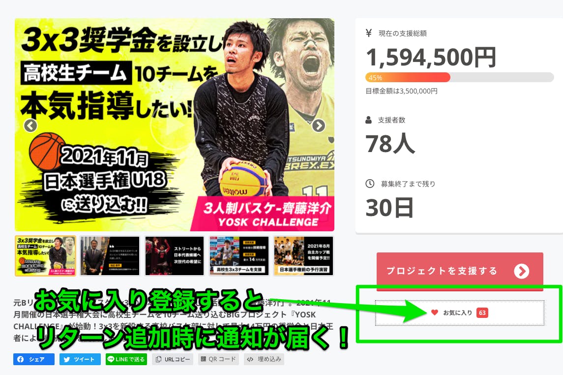 リターン追加販売の開始は5/10前後になると思うので「お気に入り登録」をお願いします!
