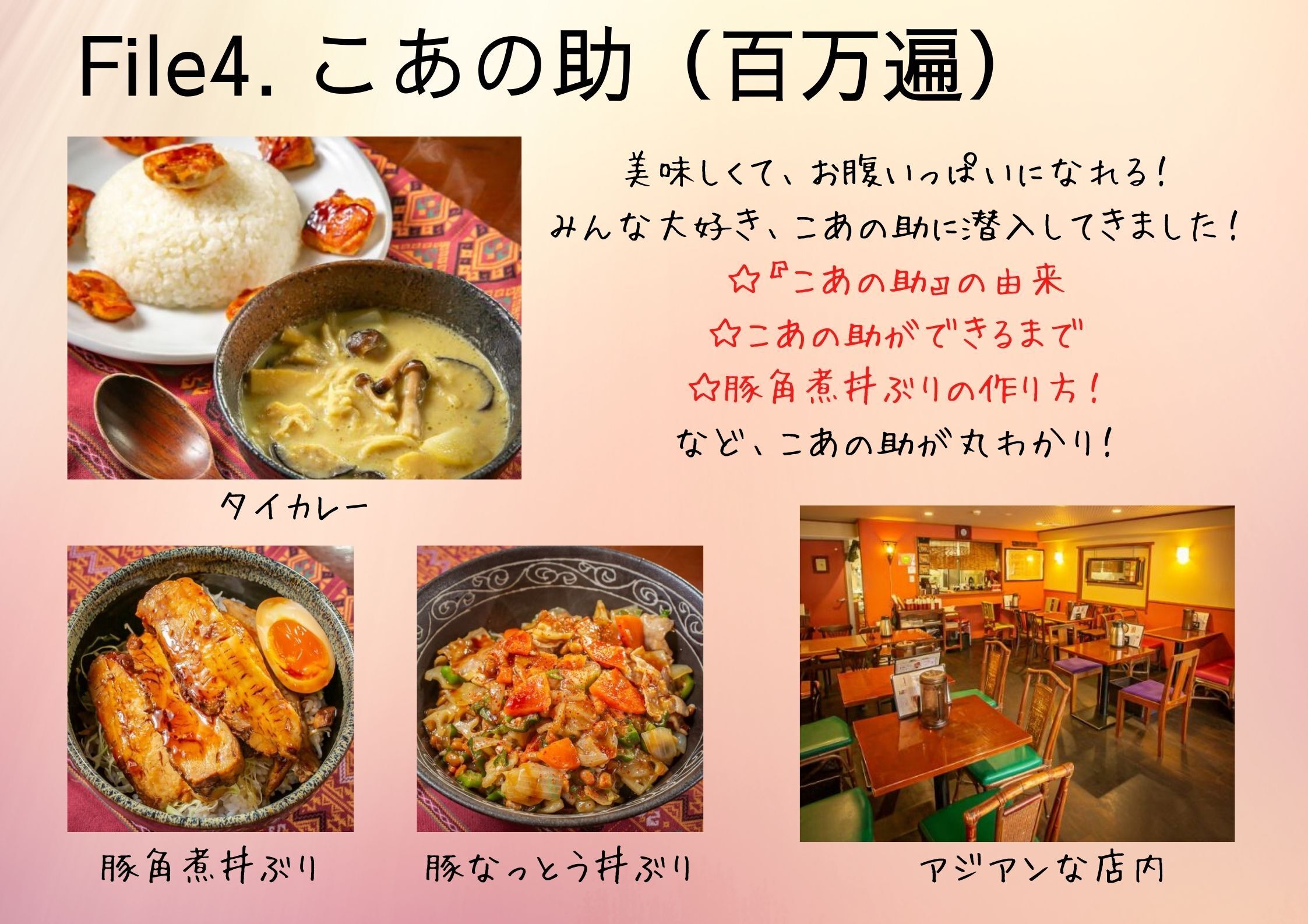 ー私はこあの助の豚角煮丼ぶりが大好きです。