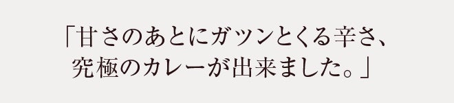 にんにく、しょうがなどの香味野菜の辛味、そして飴色に炒めた玉ねぎ、はちみつ、りんご、マンゴー、バナナの爽やかな甘さがカレーのベースとなり味のグレードをアップさせる。