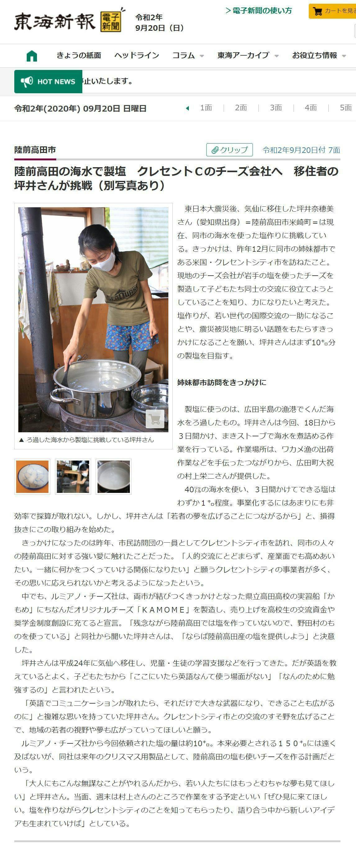 9月、最初の塩づくりの日にきてくださった地元の東海新報さん