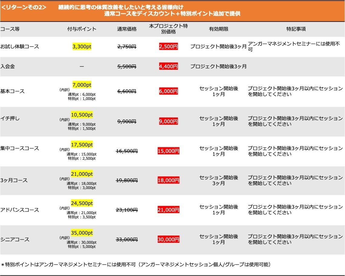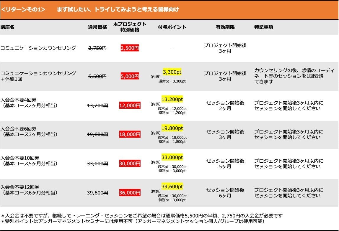 ⭐︎第一リターン・・・青色バナーで表示されているリターン6項目(入会金不要でとにかく何はともあれやってみようという方向けです)
