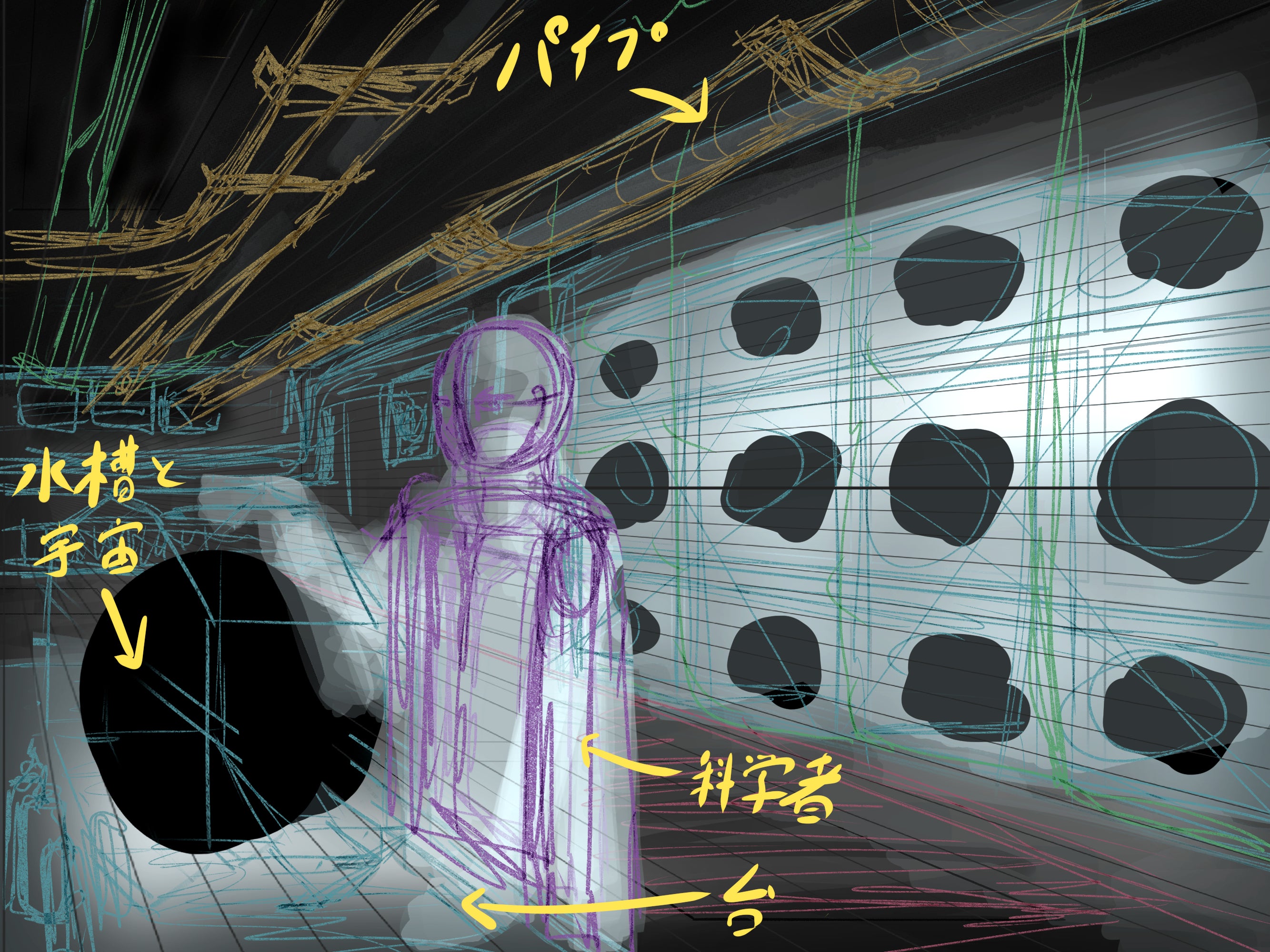今回のイラストはストーリーの設定上,今我々がいる宇宙の外に存在する世界が舞台です.そこはロボットと人間が争う世界であり,主要キャラである科学者は水槽に入った数々の宇宙からロボットと人間が共存する惑星を探し出すことを目的としています.