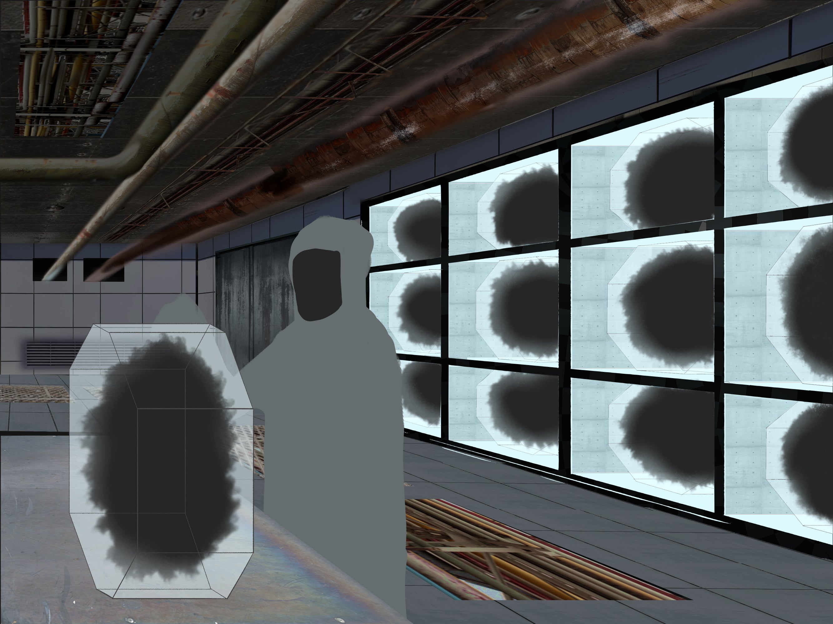 全体的に薄暗い雰囲気とパイプが張り巡らされた構図にすることで,どこか隠された施設を匂わせるように意識しました.