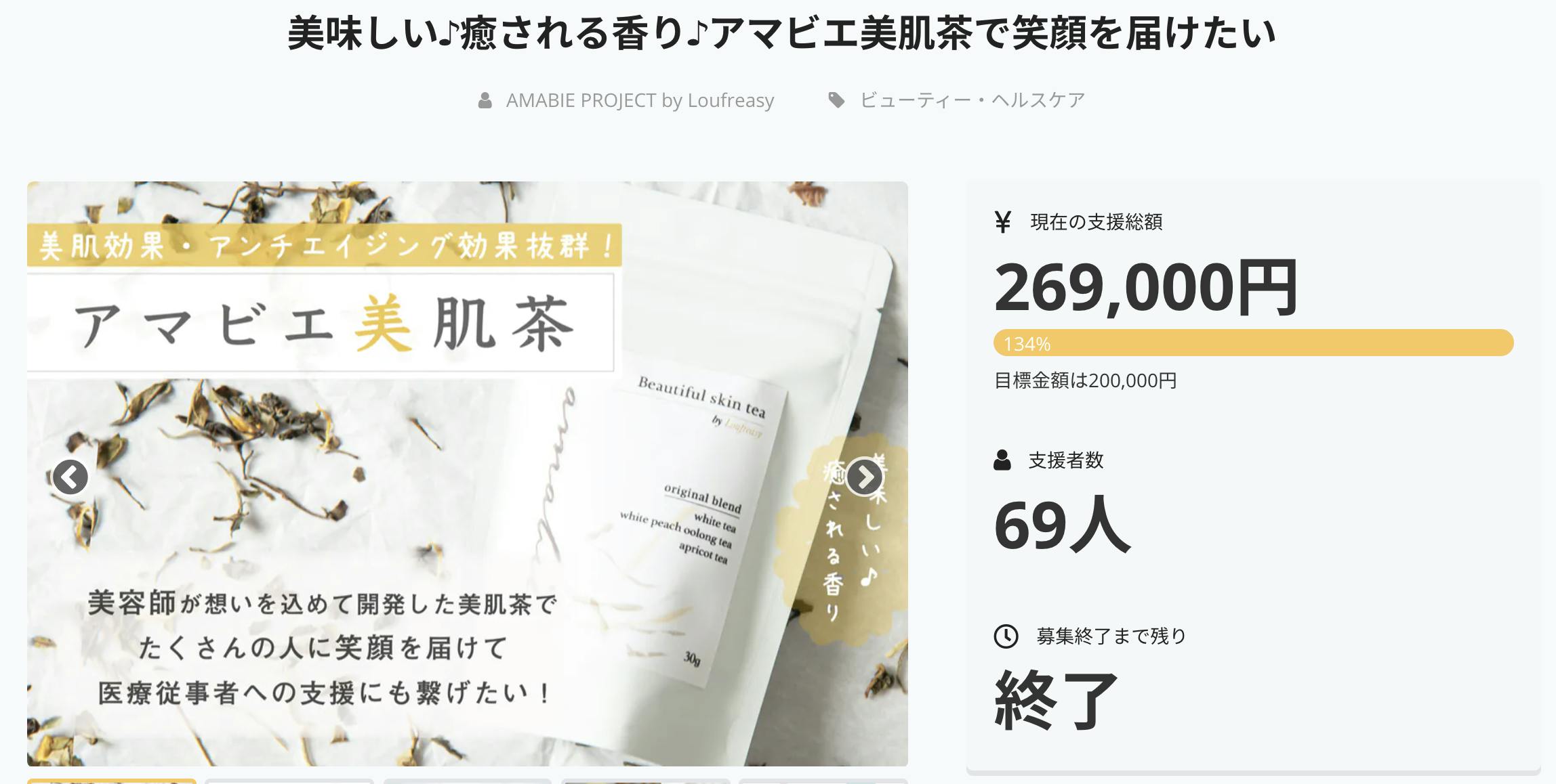 2020/12/01 17:18こんにちは、ラフリジー・アマビエプロジェクト主宰のトザワです『ヘアスタイルやメイク、ファッションなどの【外見】はもちろん“美しい”ということの根本となる【インナービューティ】【健康美】【カラダの中からの“キレイ”】もサポートさせて頂きたい!』美容の専門家・現役美容師であるぼくが、そんな想いを込めて開発した美肌効果やアンチエイジング効果・デトックス効果抜群!美味しい♪癒される香りの【アマビエ美肌茶】このお茶でたくさんの人に “キレイ” と “笑顔” を届けて医療従事者支援にも繋げたい!そんな想いで挑戦した、今回のクラウドファンディングぼくたちの“想い”にご共感頂いたたくさんの方からのご支援のお陰様を持ちまして【 134% 】で達成し、無事終了致しました!ぼく自身にとっても、初めてのクラファンへの挑戦ぶっちゃけ、めちゃめちゃ不安で心配でした!!!!!!笑『世間では全く誰にも知られていない東京・代々木の片隅にある小さな美容院の挑戦なんて応援してくれる方がいるんだろうか…』毎日そんな気持ちでこのクラファンの【管理画面】を何度も何度も確認し笑動くもの全てに頭を下げてるんじゃないか!?というくらい友人・知人、その日に会った全ての人に自分の“想い”を伝え頭を下げるそんな、アッという間の1ヶ月間でしたがご支援頂いた皆様から頂いたこんなコメントに本当に元気や勇気を頂きながらなんとか達成することができましたご支援頂いた皆様ぼくたちの挑戦を応援して下さっている皆様本当に、本当にありがとうございました【ご支援頂いた皆様へ】★ご自宅への郵送の方12/9 頃から、リターンの商品を順次発送させて頂きます12月中旬頃までには、全ての方にリターンをお届けできる予定となっておりますので楽しみにしていて下さいね✳︎★代々木ラフリジーでお受け取りの方12/9 頃には、リターンの商品のご準備が完了する予定ですお渡しの方法など、詳細につきましてはメールにてご連絡させて頂きますのでご確認のほど、何卒宜しくお願い致します【『アマビエ美肌茶』につきまして】アマビエ美肌茶につきましては、正式に商品化し代々木ラフリジー のサロン店頭と【ラフリジー・アマビエプロジェクト】の OFFICIAL WEB SHOP の両方で販売を開始する予定です正式に販売を開始した後も、売り上げの【5%】をコロナ禍収束への希いを込めて引き続き【国際国立感染症センター】に寄付を続けていきます販売開始は、12月中旬を予定しておりますので楽しみにお待ち下さいませ✳︎【医療従事者の方々への支援につきまして】今回のクラウドファンディングで皆様から頂いた支援総額【 269,000円 】の【 10% 】にあたる【 26,900円 】はぼくたちはもちろん全人類共通の希いである『コロナ禍収束』への想いを込めてコロナウイルスを含めた感染症の診療・研究を推進しぼくたちが生きているこの社会を維持するためにコロナ禍の最前線戦で戦って下さっている【国立国際医療研究センター】の医療従事者の方々への支援ために使用させて頂きますCAMPFIRE 様の規定によりクラウドファンディングで集めた資金の一部を第三者に直接寄付することができないため今回のクラウドファンディングで皆様から頂いたご支援は一度、この【アマビエ美肌茶】を正式に商品化するための資金として使用させて頂き正式に商品化し、販売を開始した後【 26,900円 】に至るまでは売り上げの全額を【国際国立感染症センター】に寄付するという形で皆様から頂いたお気持ちを、責任をもってお届けします寄付の完了は、2021年の1月末を予定しておりますので完了しましたらこの【活動報告】でもきちんとご報告させて頂きます【 “小さなこと” を “大きな心” で 】『私たちには “大きなこと”はできません“小さなこと”を “大きな心”でするだけです』マザーテレサは、こう言ったそうですぼくたちが“想い”を込めて“商品としてのクオリティ” にもとことんこだわって創ったこの【アマビエ美肌茶】でカラダの中から“キレイ”になりながら健やかな毎日を “ 笑顔 ” で過ごして頂くことをぼくたちが生きているこの社会を支えるために最前線で戦って下さっている医療従者の方々への支援にも繋げる【ラフリジー・アマビエプロジェクト】というぼくたちの挑戦はまだ始まったばかりぼくたち美容師には、ウイルスを消滅させる薬を開発することも感染症で苦しむ患者さんの治療をすることもできませんでもこの活動にご賛同頂ける皆様応援して下さる皆様のお力をお借りしながらこの【ラフリジー・アマビエプロジェクト】を皆様と一緒に続けていくことで世界人類共通の希いであるコロナ禍の収束はもちろん人のため 社会のためにできること今の自分たちにできることを、前向きに続けていきたい一人一人の“小さな力”を合わせて優しい 明るい “笑顔あふれる未来”を、皆様と一緒に創っていきたいぼくたちは、心からそう思っておりますまだ
