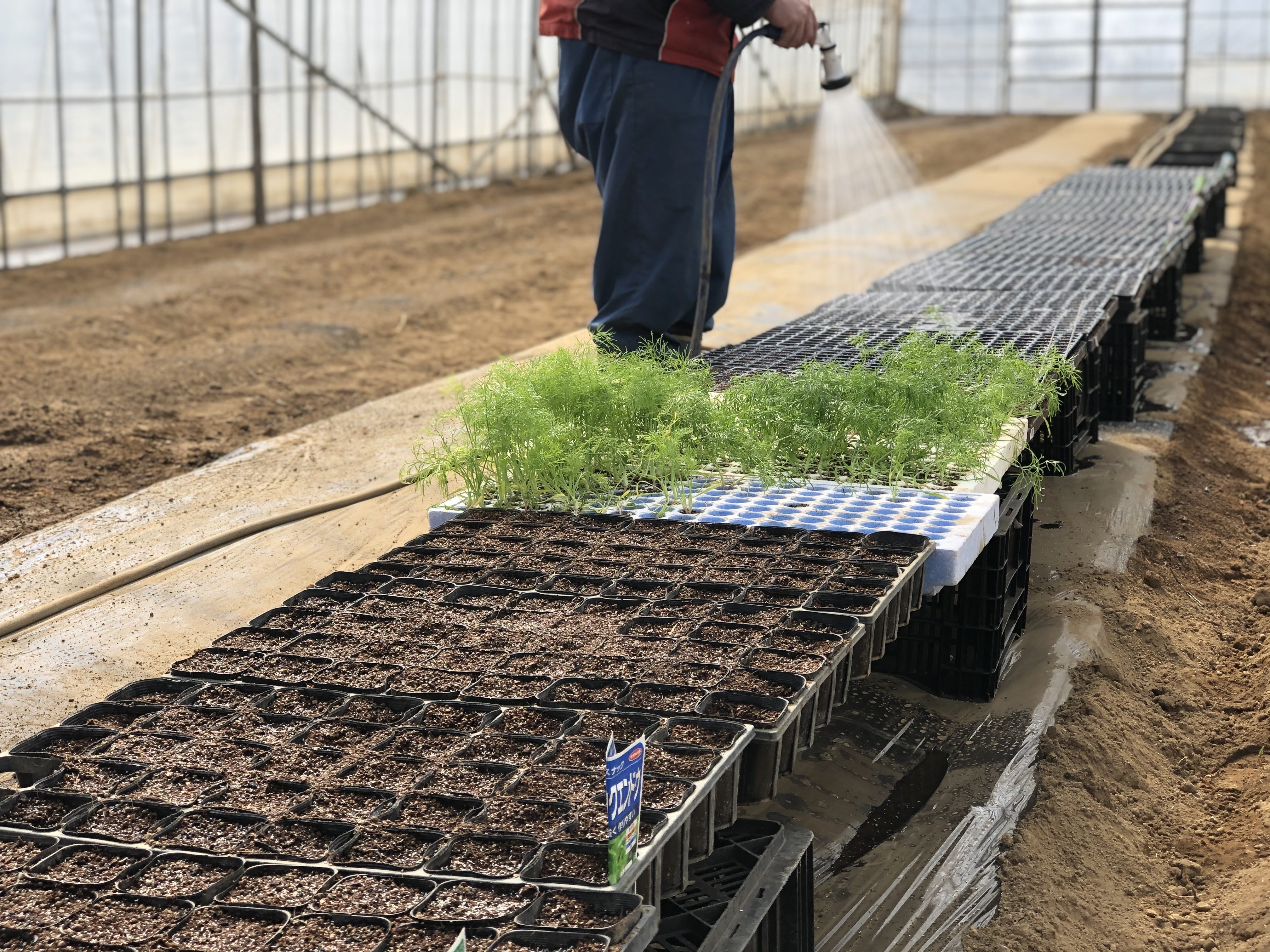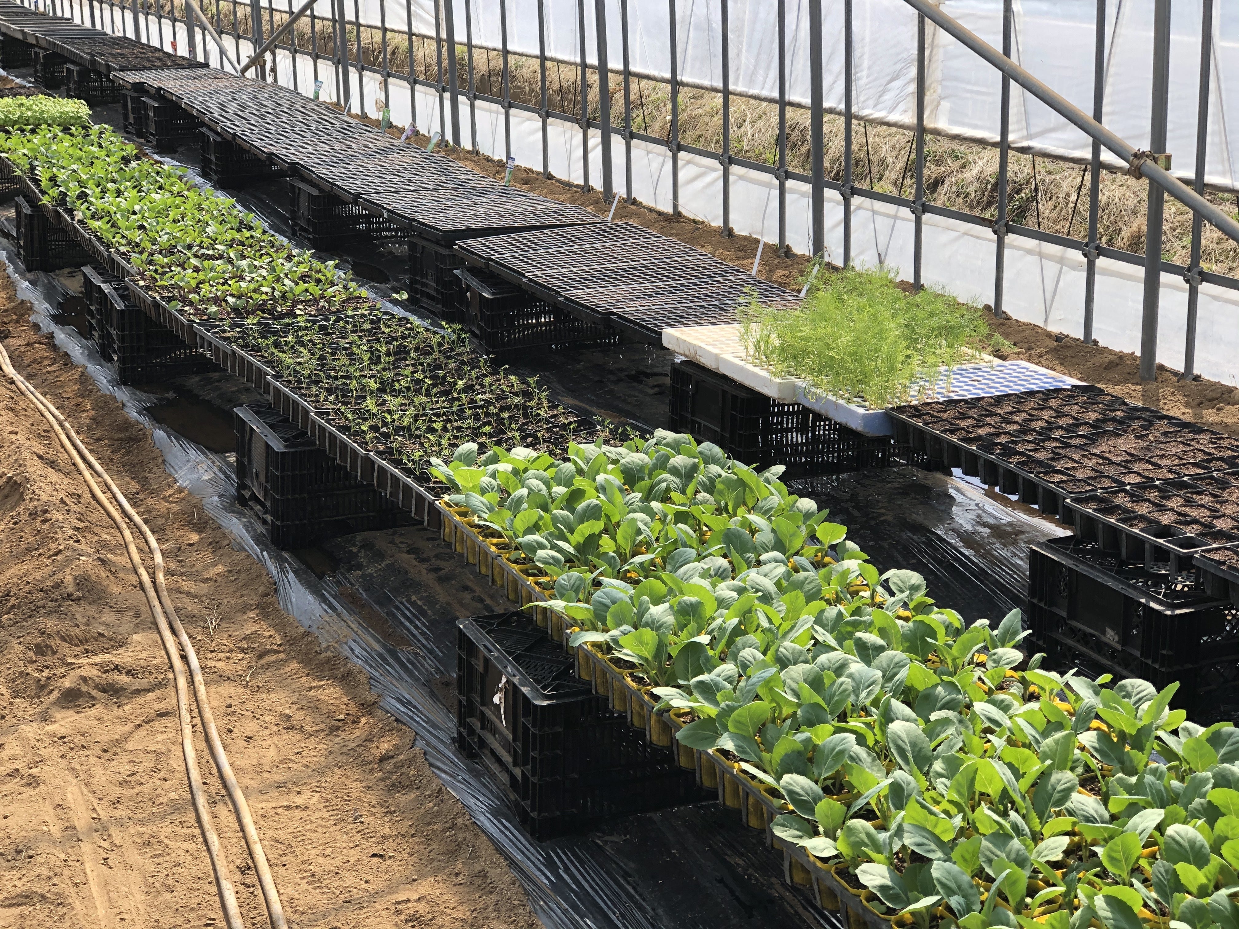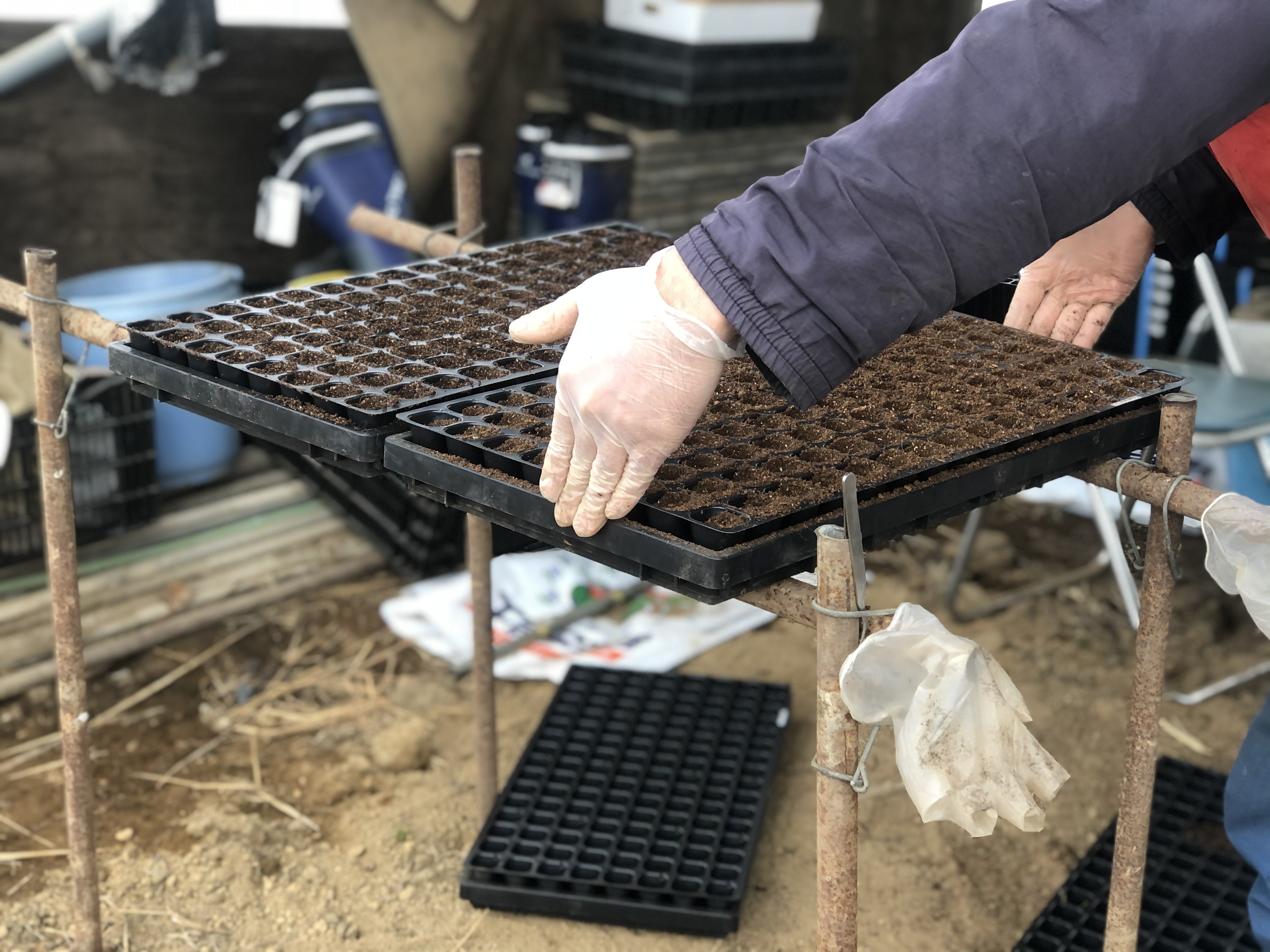 前回お伝えしたとおり、近場に大きなビニールハウスを借りることができたので、ハウス内では育苗作業も進めています。