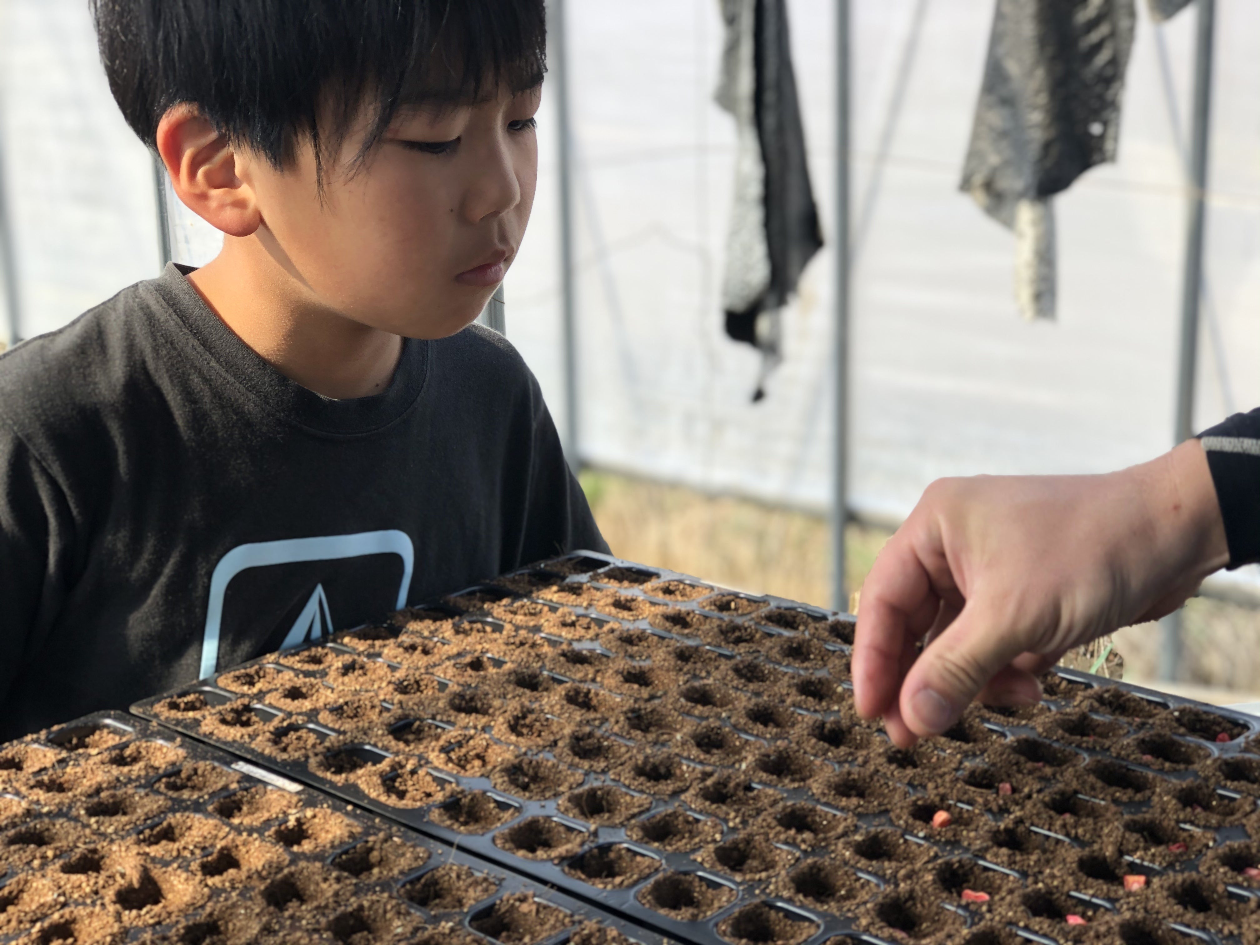 種をまく夫の手を不安そうにじっと見守る息子