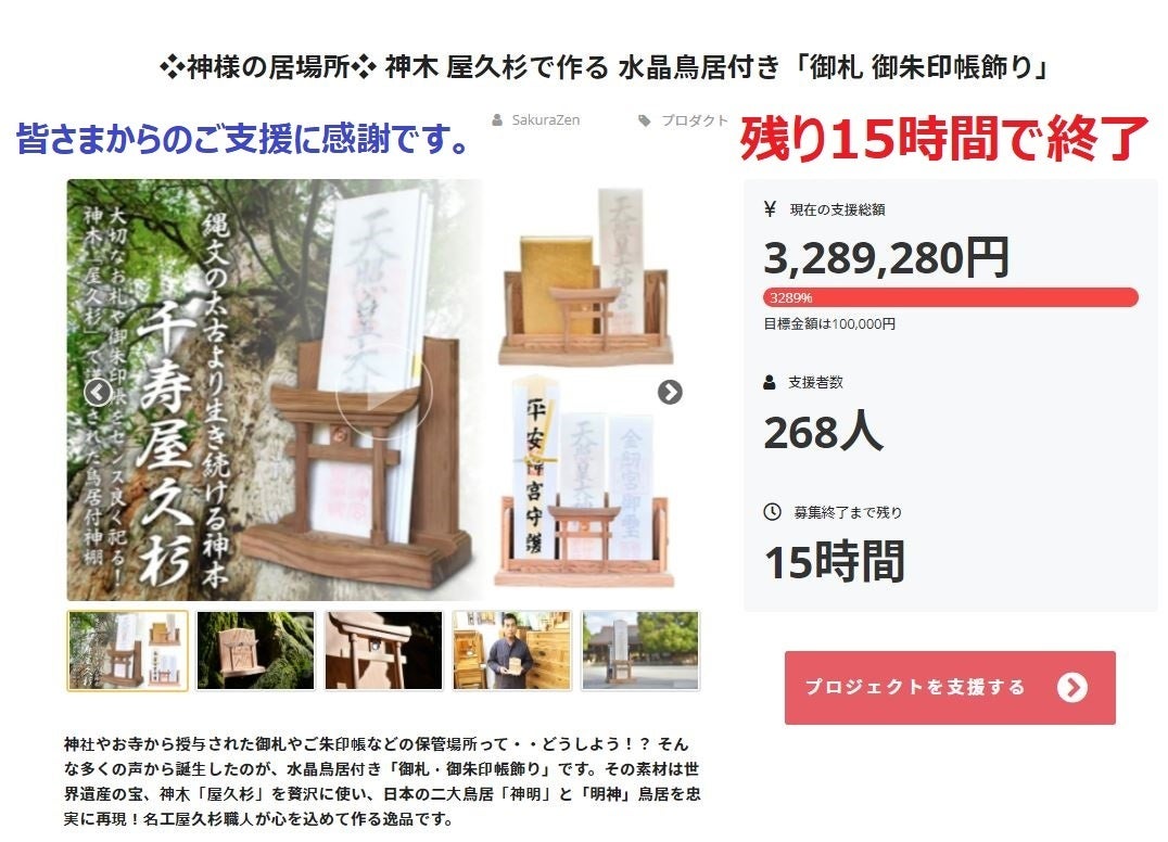 ご支援者の皆様へこの度は❖神様の居場所❖ 神木 屋久杉で作る 水晶鳥居付き「御札 御朱印帳飾り」プロジェクトに多くのご支援を頂戴し誠に有難うございます。おかげさまで大変多くのご支援者様からのご支援とご声援を頂いております。本当に有難うございます。<(_ _)>プロジェクト期間も本作品も残りわずかとなりました。★一言でも【SNSなどでのプロジェクト情報拡散】にご協力を頂けますと幸いです。何卒、宜しくお願い申し上げます。<(_ _)>神木屋久杉「御札 御朱印帳飾り」普及プロジェクトチーム一同