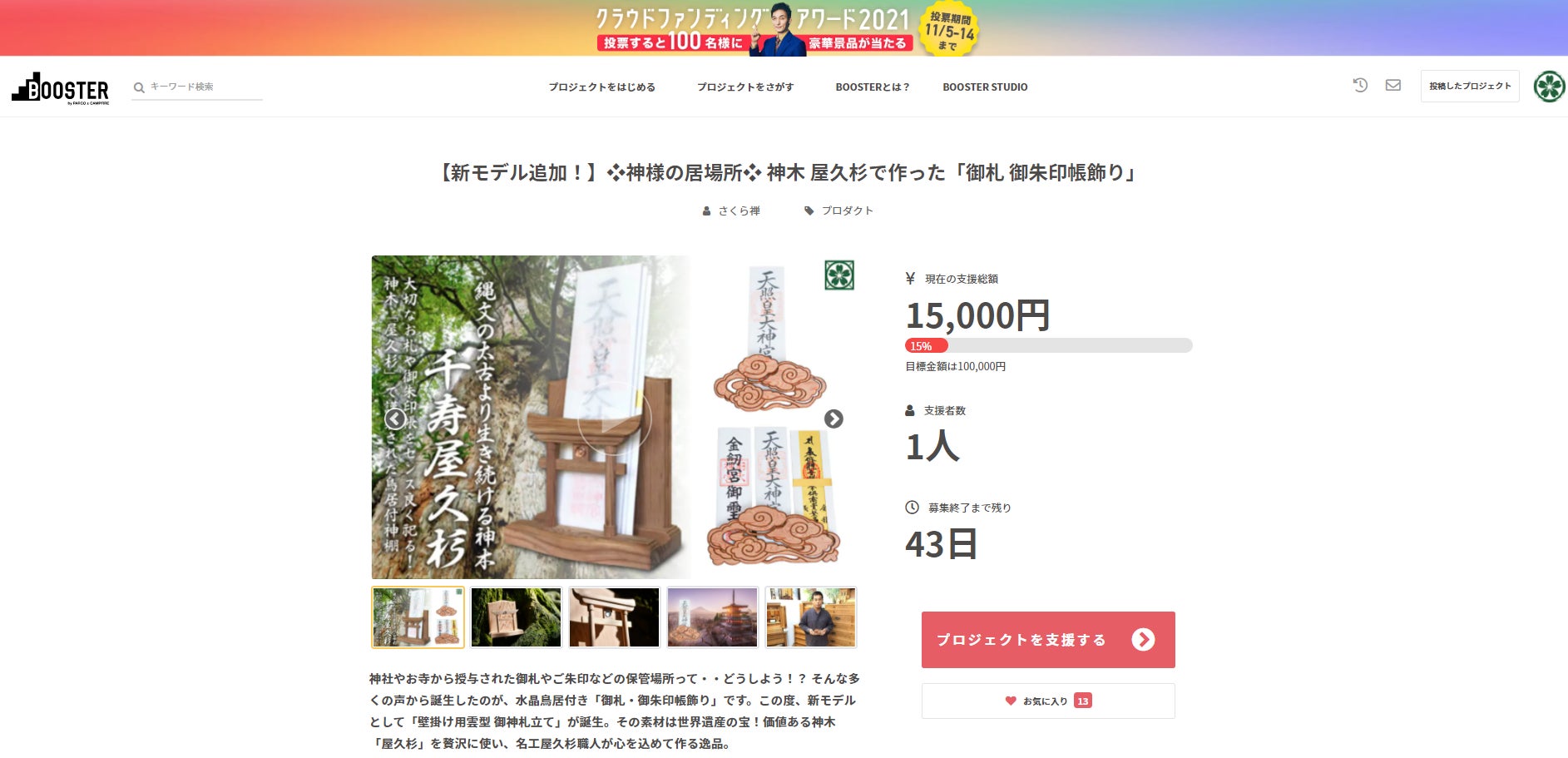 どうも❖神様の居場所・神木屋久杉「モダン神棚」プロジェクトのさくら禅です。ご支援者の皆さまへ嬉しいお知らせです。以前、ご支援頂きました神木屋久杉「御札御朱印帳飾り」のご使用感はいかがでしょうか!?★この度、ご支援者様への限定企画と致しまして!主題のインスタグラム屋久杉「御札 御朱印帳」お祀り写真投稿キャンペーンを実施させて頂きます。皆様とご縁のあった神様(御札 御朱印帳)の本品へのお祀り写真をインスタグラムへご投稿下さい。【キャンペーン概要】・インスタグラムへの投稿期間は本日12月11日(土)~20日(月)正午までの10日間。・ご投稿と共にハッシュタグ➡  #屋久杉モダン神棚  を付けて下さい。・メンションは @info.sakurazen でお願いします。https://www.instagram.com/p/CXVk5ThttfK/★ご投稿頂きましたご支援者さまの中からグランプリ賞・準グランプリ賞・ほほ笑み賞を選出し、下記の品を進呈させて頂きます。◆新作・雲型壁掛け飾りのご確認は下記のURLから確認頂けます。https://camp-fire.jp/mypage/projects/4717871.グランプリ賞=神木屋久杉・壁掛け用雲型(スタンダード)2.準グランプリ賞=神木屋久杉・壁掛け用雲型(コンパクト)3.黄金の開運根付(銭亀・打ち出の小槌・ひょうたん)のいずれか1点さくら禅公式 instagramアカウントもフォローして頂くと幸いです。沢山のご応募お待ちしております。