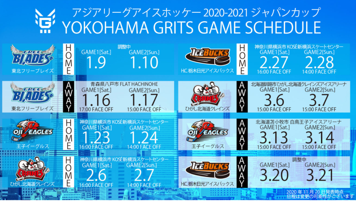 横浜GRITSクラウドファンディング、御支援いただきありがとうございます!クラウドファンディング最終締切まで残り2日となりました。12/30まで!連日皆様からの御支援をいただき、感謝の気持ちでいっぱいです。コロナ渦の中でのチーム初年度となりましたが、ここまでこれましたのも、多くの皆様からの応援のおかげです。クラウドファンディングではここでしか手に入らない限定グッズを多数揃えておりますので、是非最後まで横浜GRITSの御支援宜しくお願い致します。また年明け2021年も是非会場へ足をお運びください!年の瀬寒さも冷え込みますが、皆様もお身体にお気をつけて、良いお年をお迎えください。▼横浜GRITSジャパンカップ試合予定https://grits-sport.com/gamehttps://grits-sport.com/news/2038▼2021年1月スケジュール-------------------------------1/9(土) 1/10(日) 東伏見横浜GRITS vs 東北フリーブレイズ-------------------------------1/16(土)17:00 FLAT八戸東北フリーブレイズ vs 横浜GRITS-------------------------------1/17(日)15:00 FLAT八戸東北フリーブレイズ vs 横浜GRITS---------------------------1/23(土)16:00 新横浜KOSEスケートセンター横浜GRITS vs 王子イーグルス-------------------------------1/24(日)14:00 新横浜KOSEスケートセンター横浜GRITS vs 王子イーグルス-----------------------------------