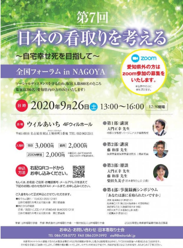 年に一度、「日本の看取りを考える全国フォーラム」を開催しております。今年は第七回目を迎えることができました。毎年、様々なジャンルの先生がたをお呼びし、「看取り」をテーマに語り考える試みをしております。