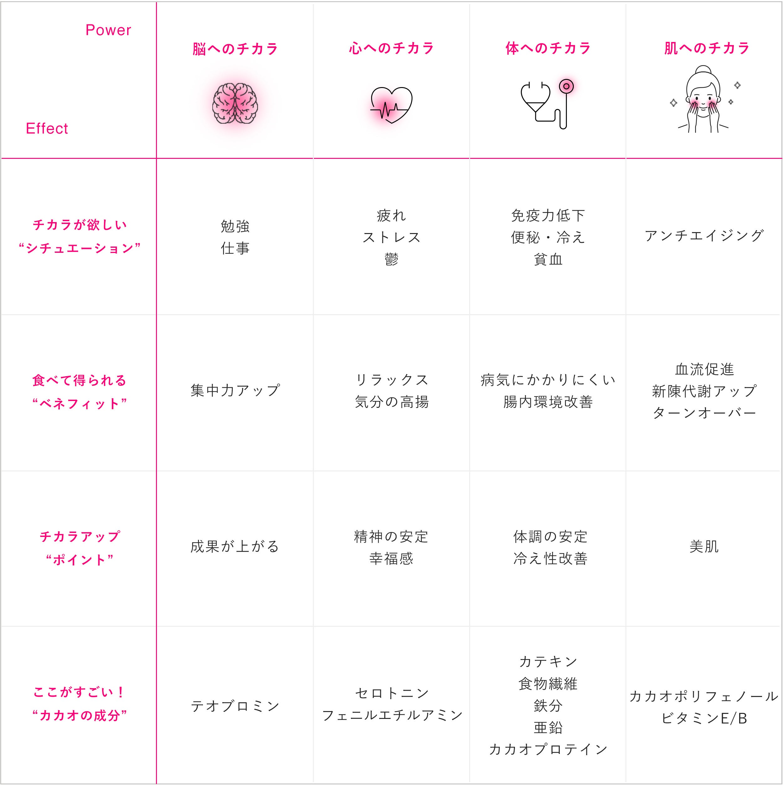 カカオポリフェノールやカカオプロテインといった栄養素は聞かれたことがある方も多いかと思いますが、カカオにはそれ以外にも脳、心、体、肌に良いチカラを与えてくれる様々な栄養素が含まれています。
