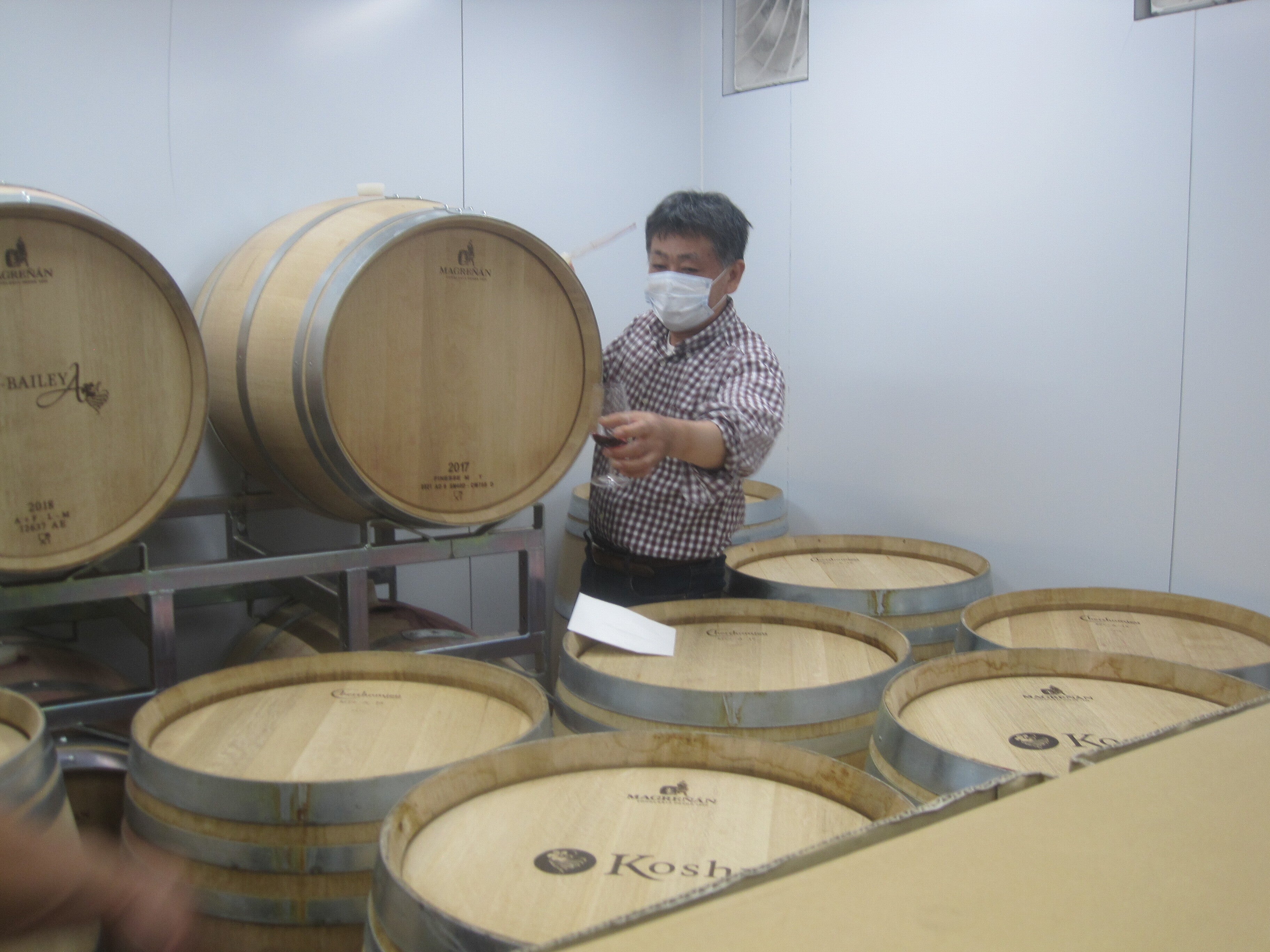 韮崎市穂坂地区で栽培されたベーリーAから作られたワインを樽で熟成しました。