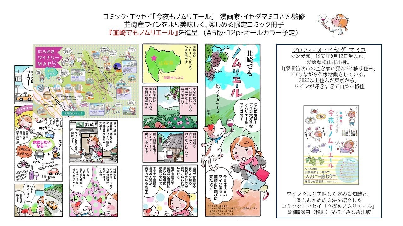 漫画家で「やまなし大使」のイセダマミコさん監修した『韮崎ワイン』をより美味しく、楽しむための知識・方法を簡潔に紹介したコミックです。