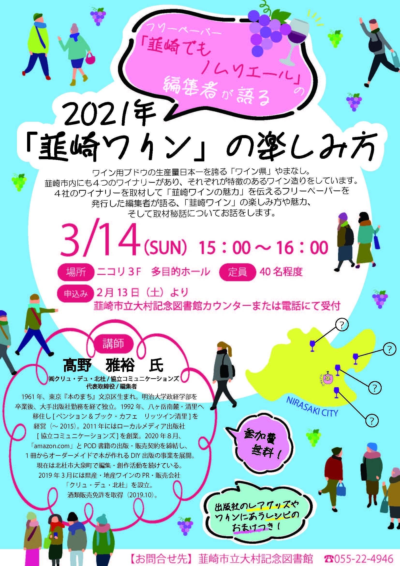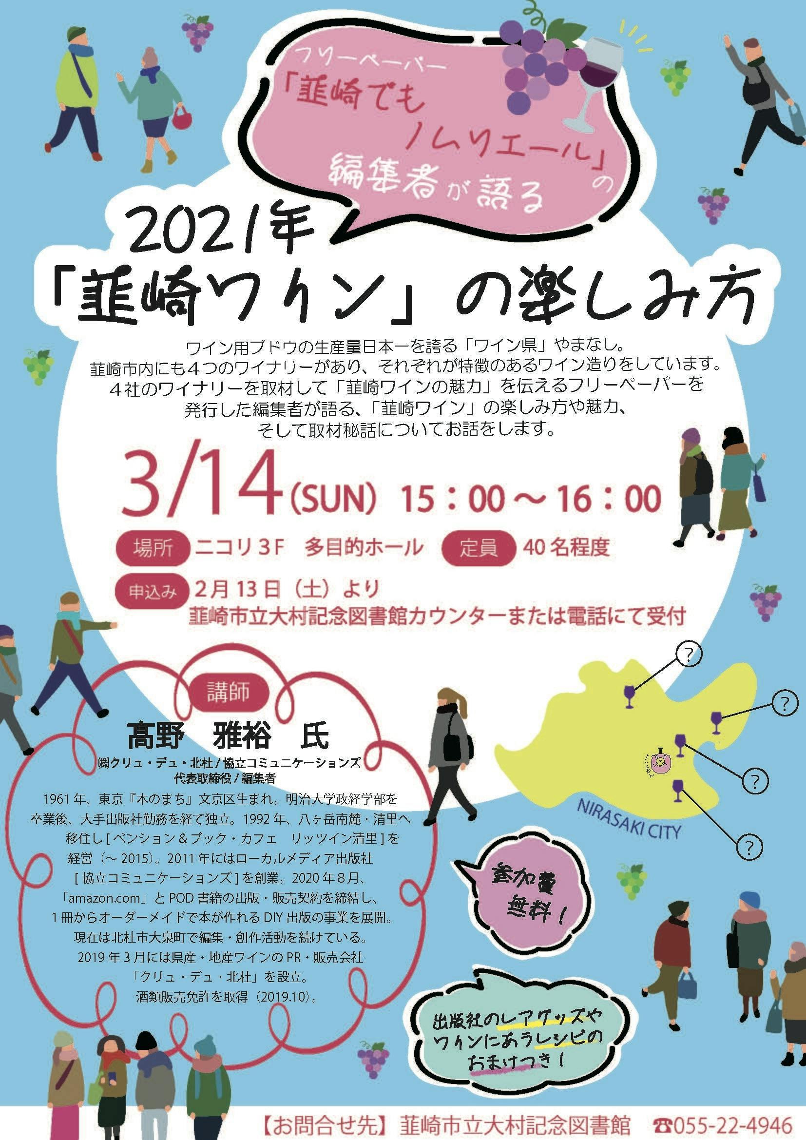 韮崎市の広報誌【広報 にらさき】最新号3月に「『韮崎ワイン』の楽しみ方」と題してワイン・セミナー開催の告知がされています!日時:3月14日(日)15:00~場所:市民交流センター「ニコリ」3F多目的ホール(入場無料・要予約)お問合せ先:韮崎市立大村記念図書館 TEL:055ー22-4946