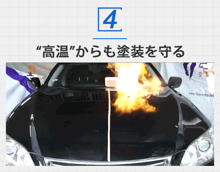 実は紫外線などの高温で劣化してしまう車のボディ。「QUICK COATING」を使用すれば紫外線からボディを守るUVカット機能が。さらに、炎の高温を直接浴びても無傷!高温環境や紫外線を恐れる日々とはもうお別れです。