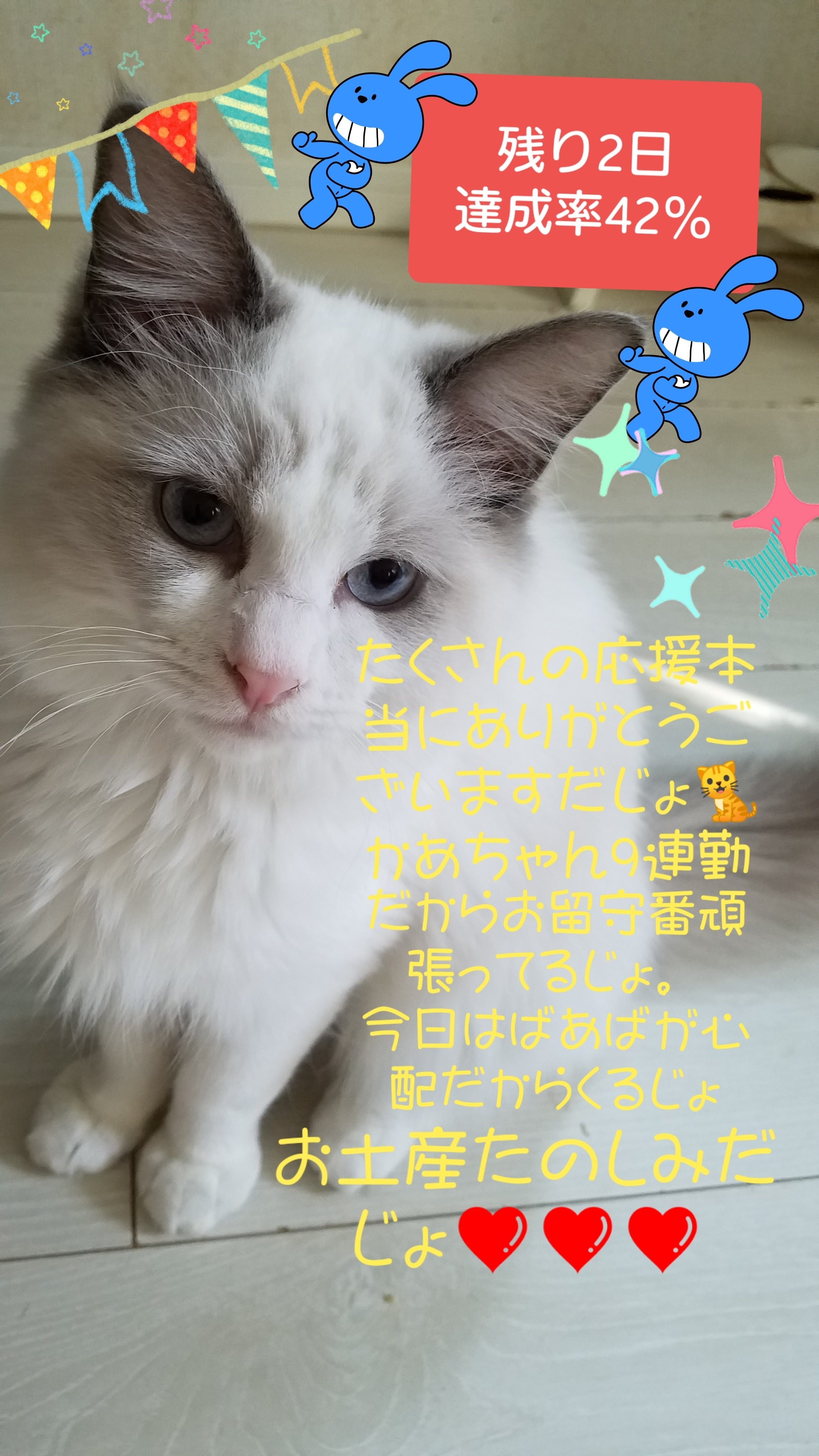 1日とのまるといれました!!私がいるとつねにご飯をねだる…この食欲はかあちゃんに似てきたの?休みの日は急に体調が悪くなりますね。あと5年若かったらもっとバリバリ働けたのに(;_;)悔しいです。あっという間に本日最終日です。本当にたくさんのご支援、応援感謝です!!猫を愛する人はあったかいです!!!!