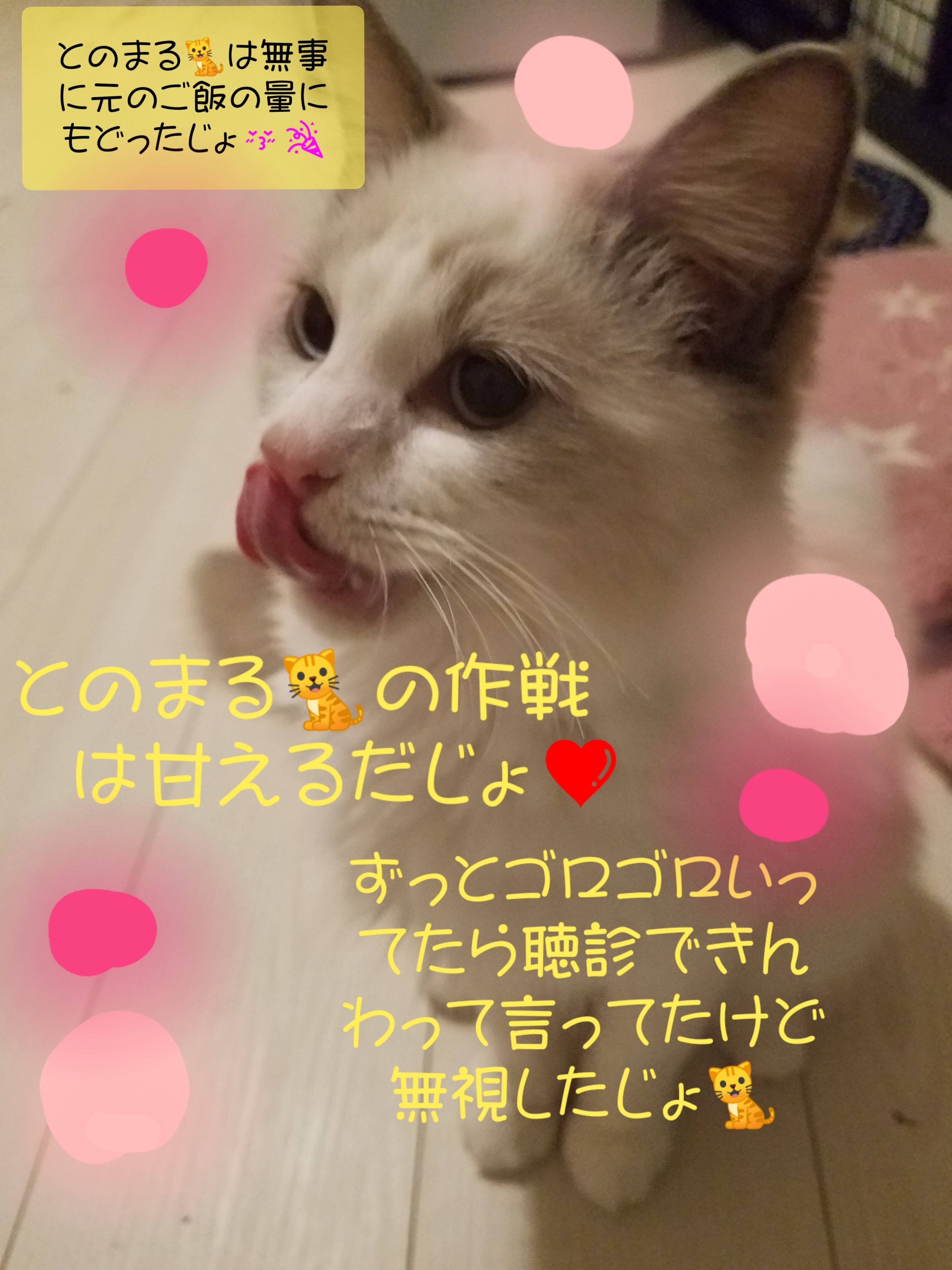 昨日、今日と朝5時起きで、早出勤なのでとのまるは朝少し元気ない感じで心配でしたが、食欲ありで帰宅後は元気に遊んでたので安心しました。お薬終わって、少し貯金を貯めるためにまだダブルワークは続くけど、それ以外はお家にいて一緒にいるからねって毎日言い聞かせてます!!爪とぎがボロボロでかわいそうなので、貯まった楽天ポイントは猫様に爪とぎをプレゼントする事にしました。喜ぶんだろうなぁ♪早く決めないとですね。今の所投薬失敗もなく本当にいい子に頑張ってくれてます!!残り5日…最後までとのまるを宜しくお願いしますm(_ _)m
