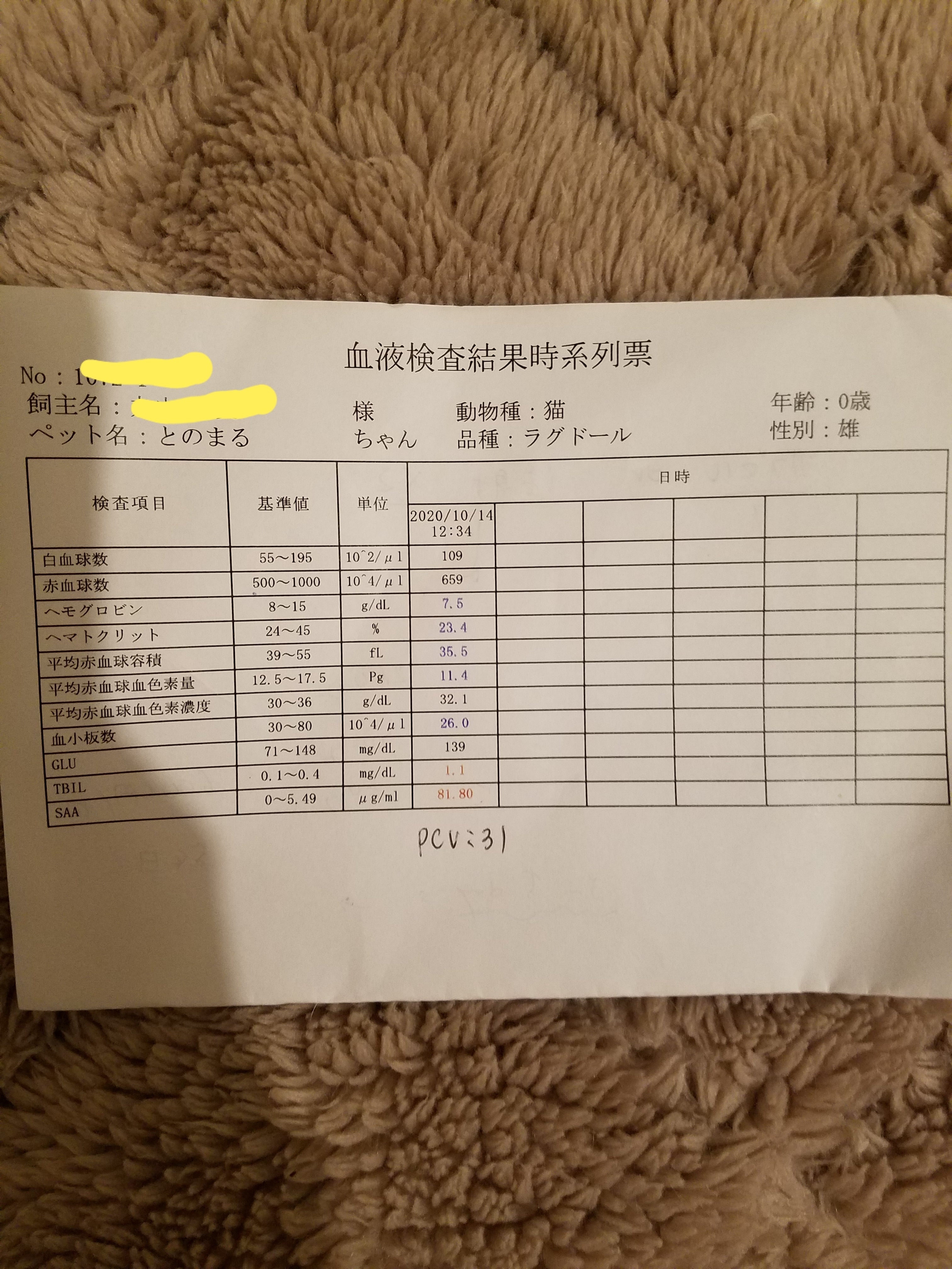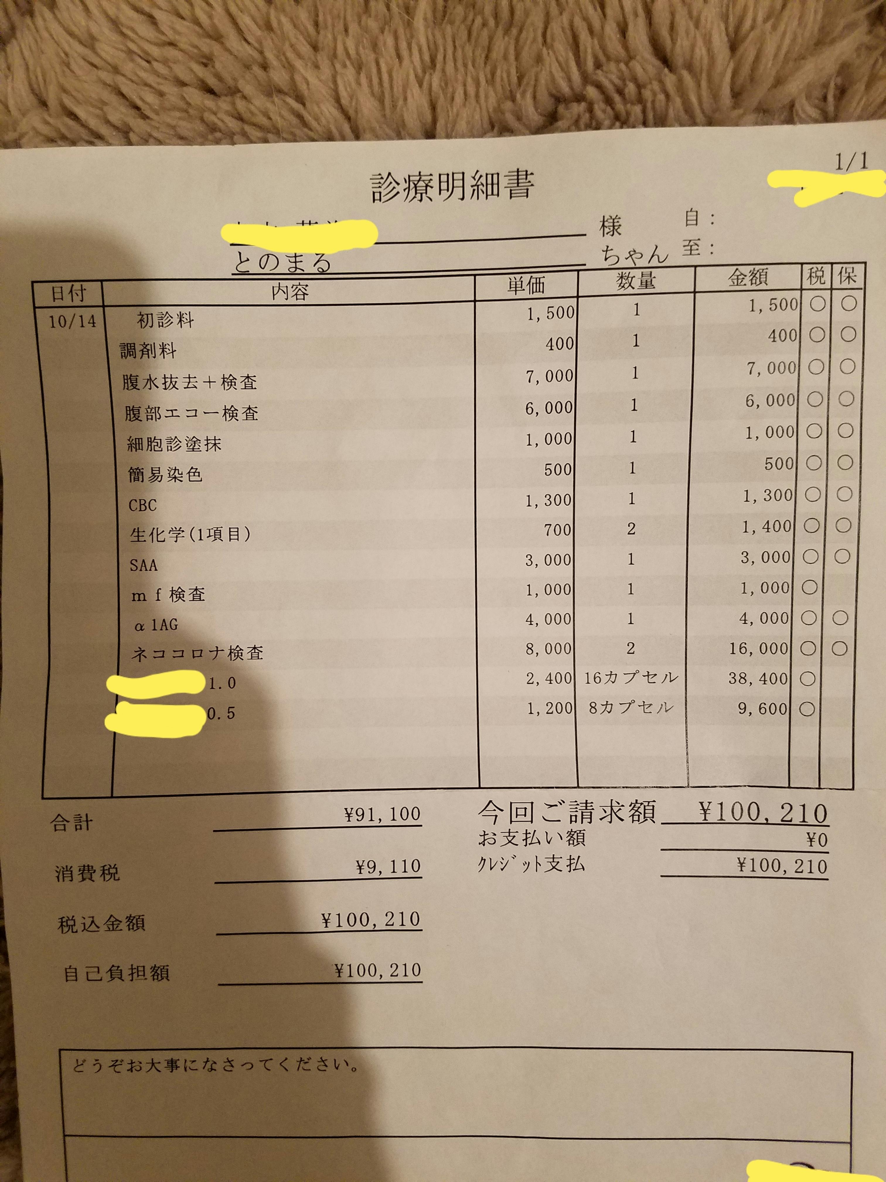 10月12日朝から何も食べず、夕方呼吸が苦しそうなので2件目の病院へ。もしかして…と思い先生に猫伝染性腹膜炎の症状じゃないですか?と伝え検査。結果はその通り。余命は宣告をされ薬は気休めと言われ何も出ず。