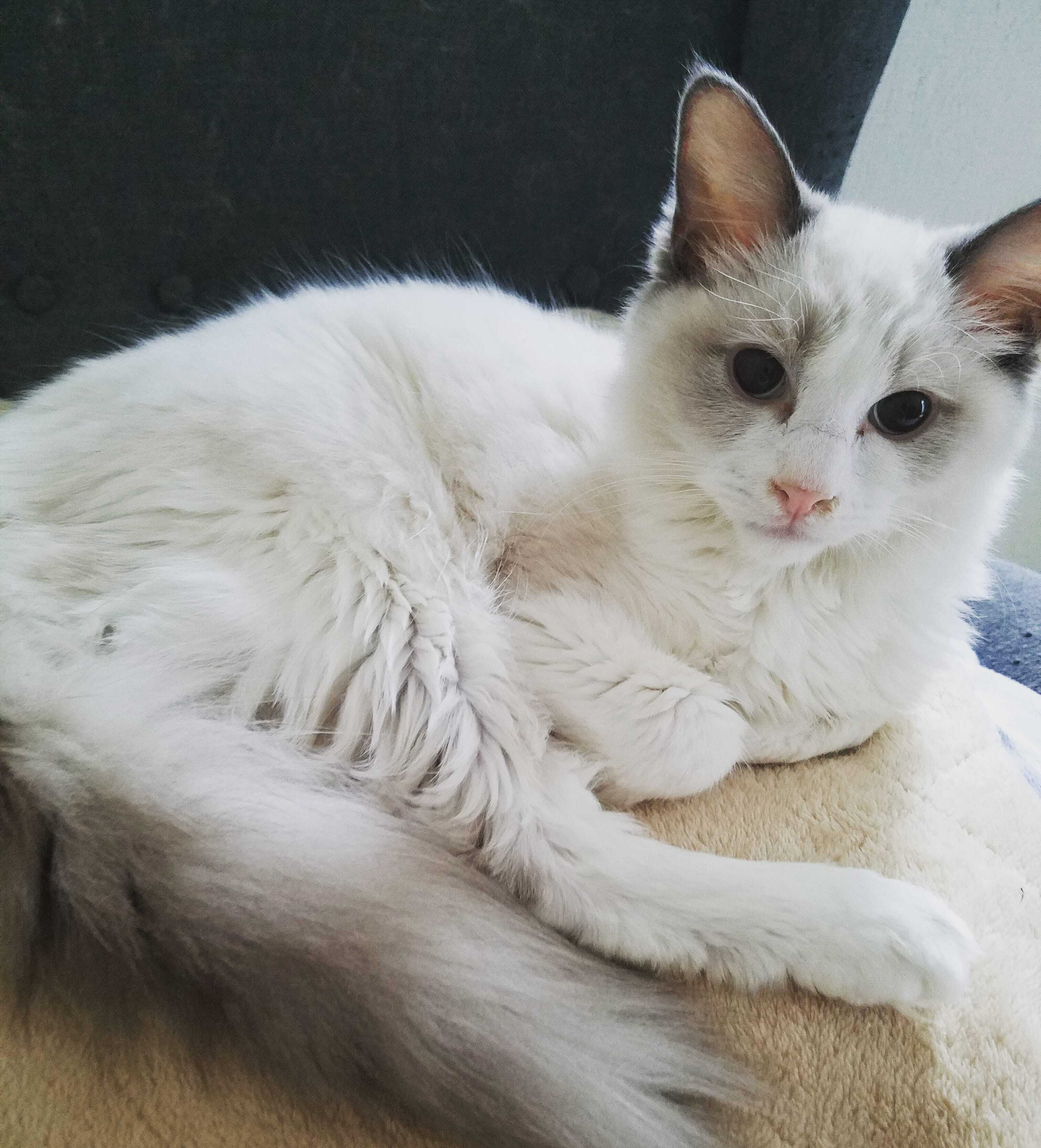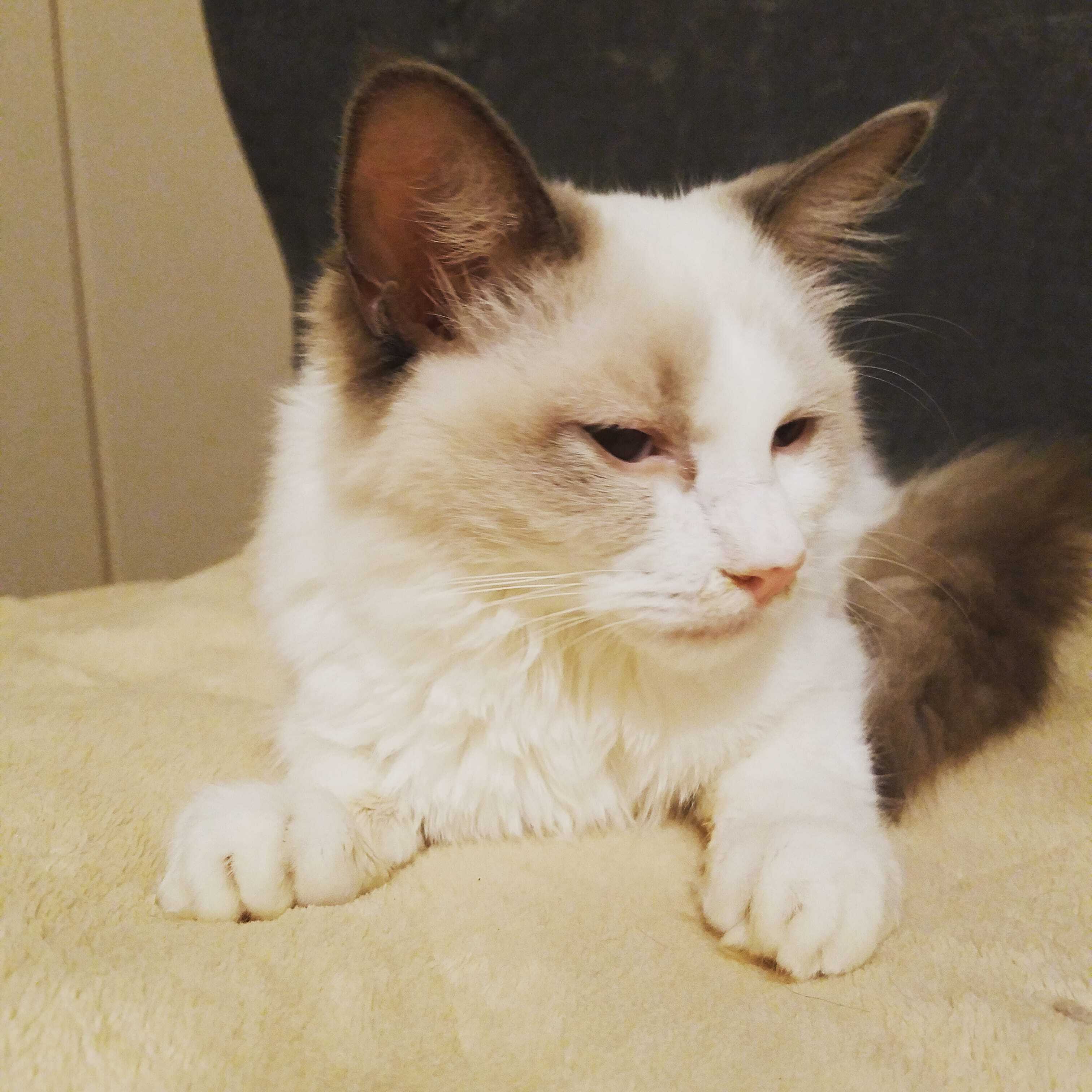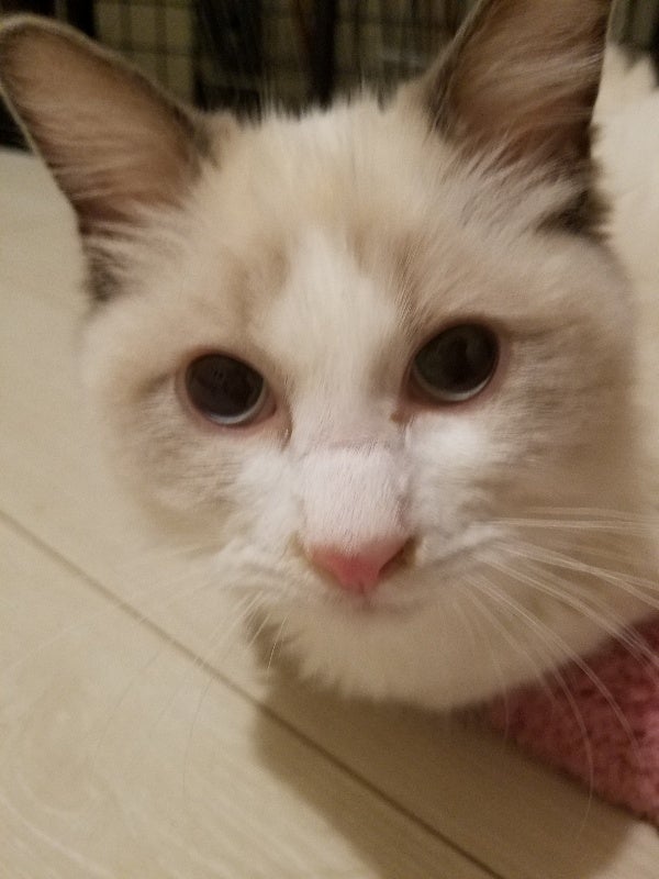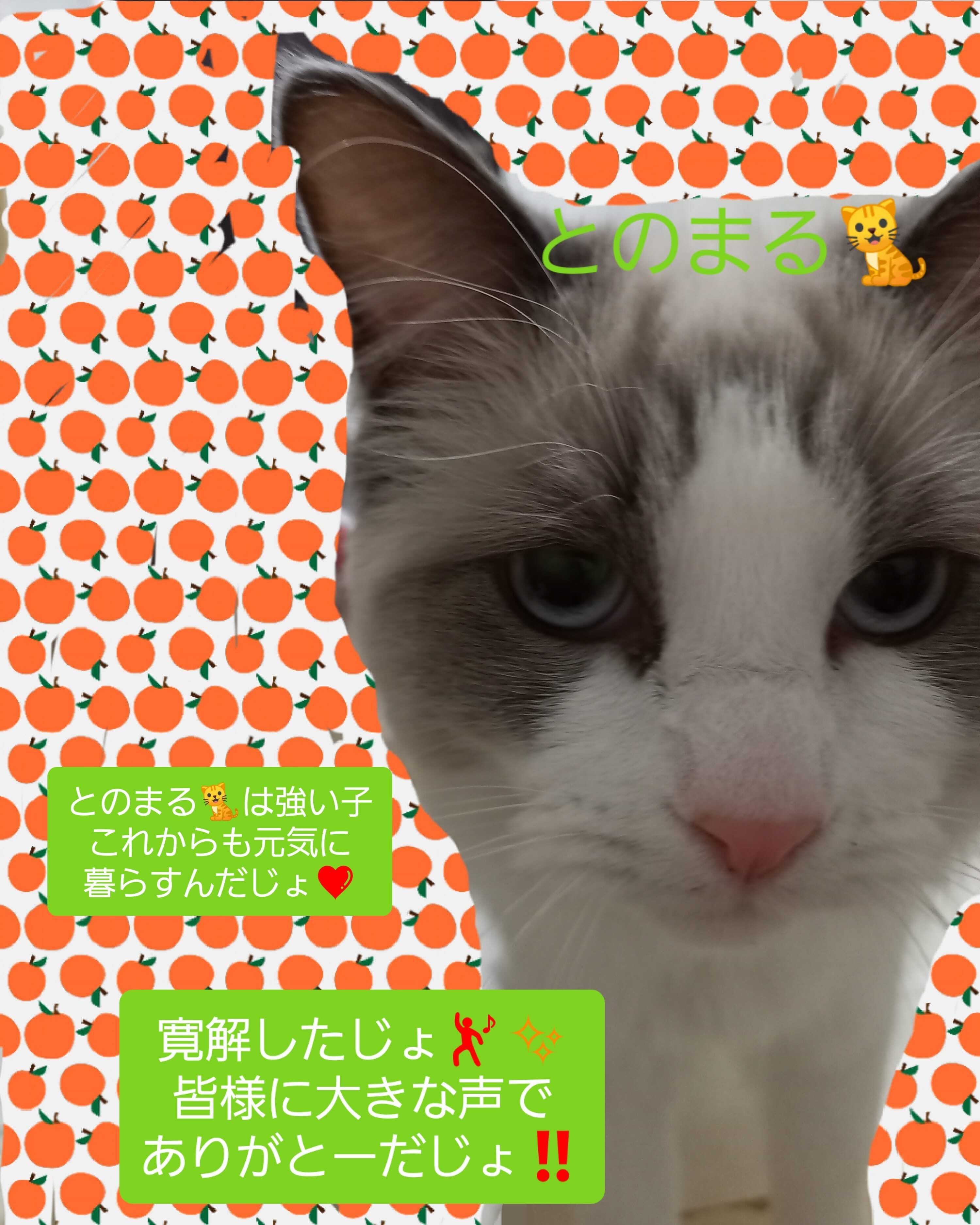 とのまるです。ラグドールという大型猫種の男の子です。誕生日は2020.5.15でまだ5ヶ月です。性格はシャイで甘えん坊らしいです。最初の飼い主さんはぼくでアレルギーが出たから一緒にいれなくなり、今のかあちゃんの家に来ました。かあちゃんはわんちゃんの保護したりして家族がいっぱいいます。ぼくはまだ1回もわんこという生き物を見た事がないです。今治療薬を飲みながら病気と戦ってます。