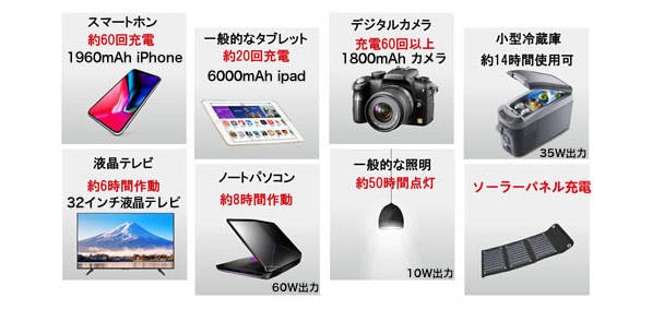 ・小型冷蔵庫 約14時間使用可能(約35W出力の小型冷蔵庫)
