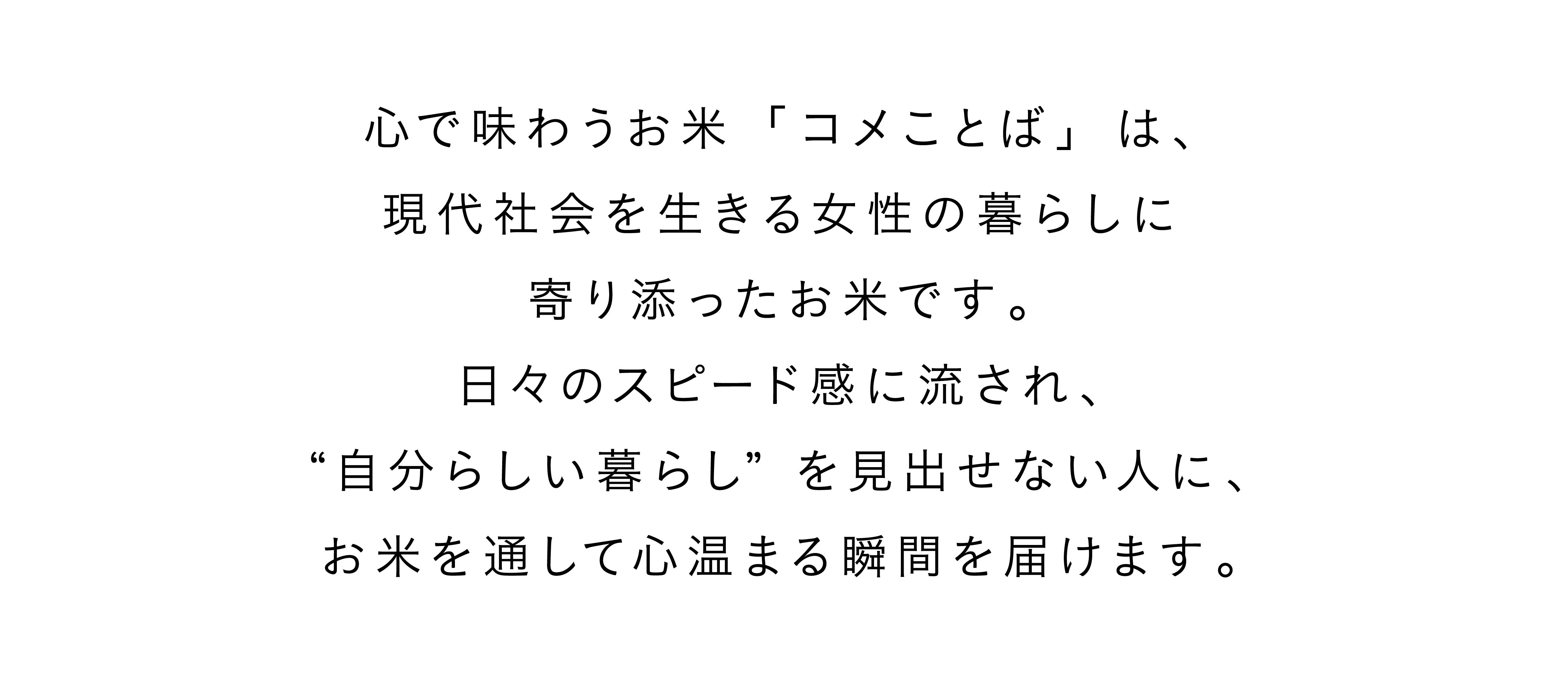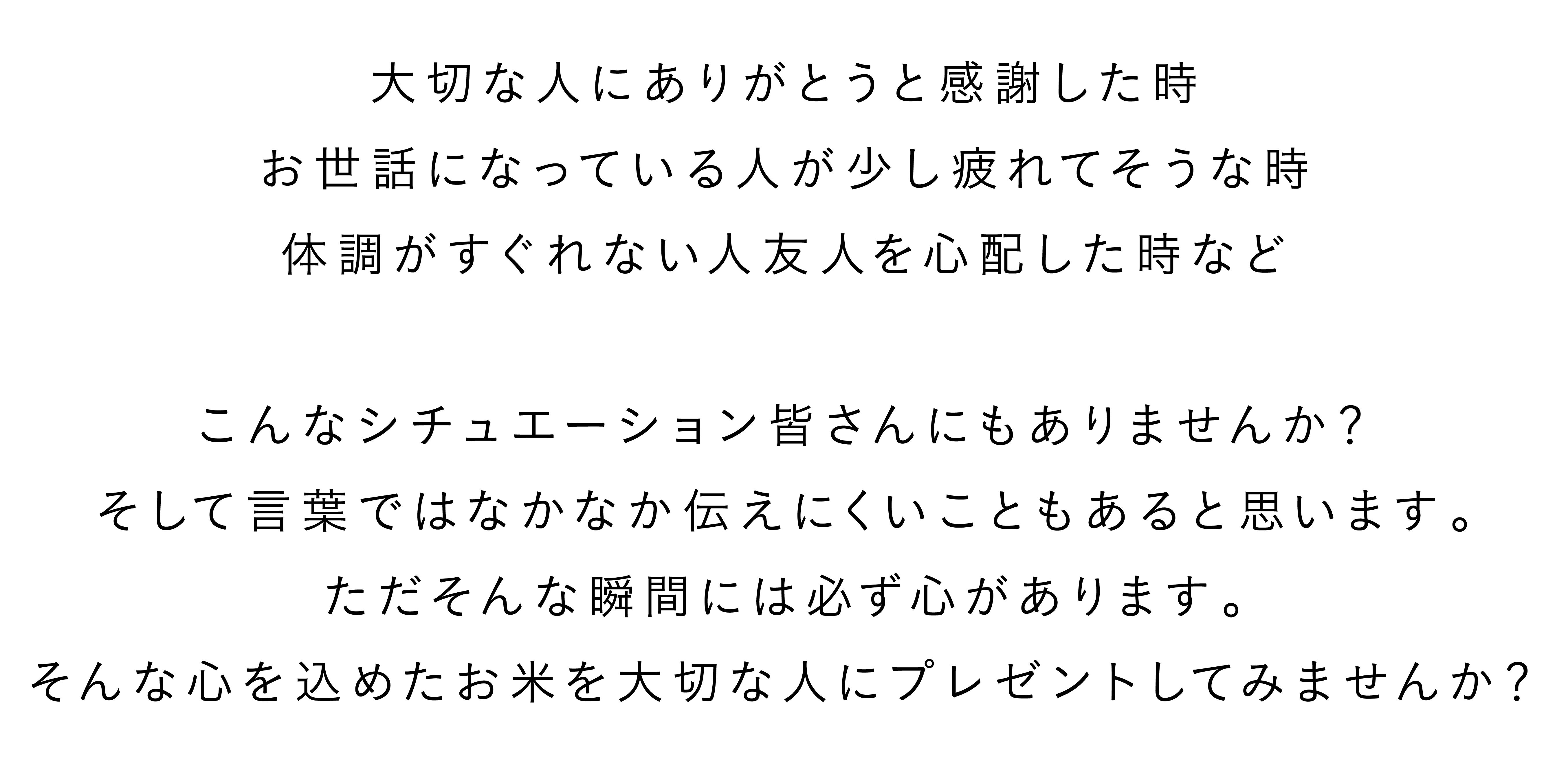 商品は、1合180mlの小分け包装です。使用したい分だけ、都度お使いいただけます。また、パッケージには、「コメことば」シリーズとして、それぞれのメッセージが綴られています。プレゼント用としてもお使いいただけます。