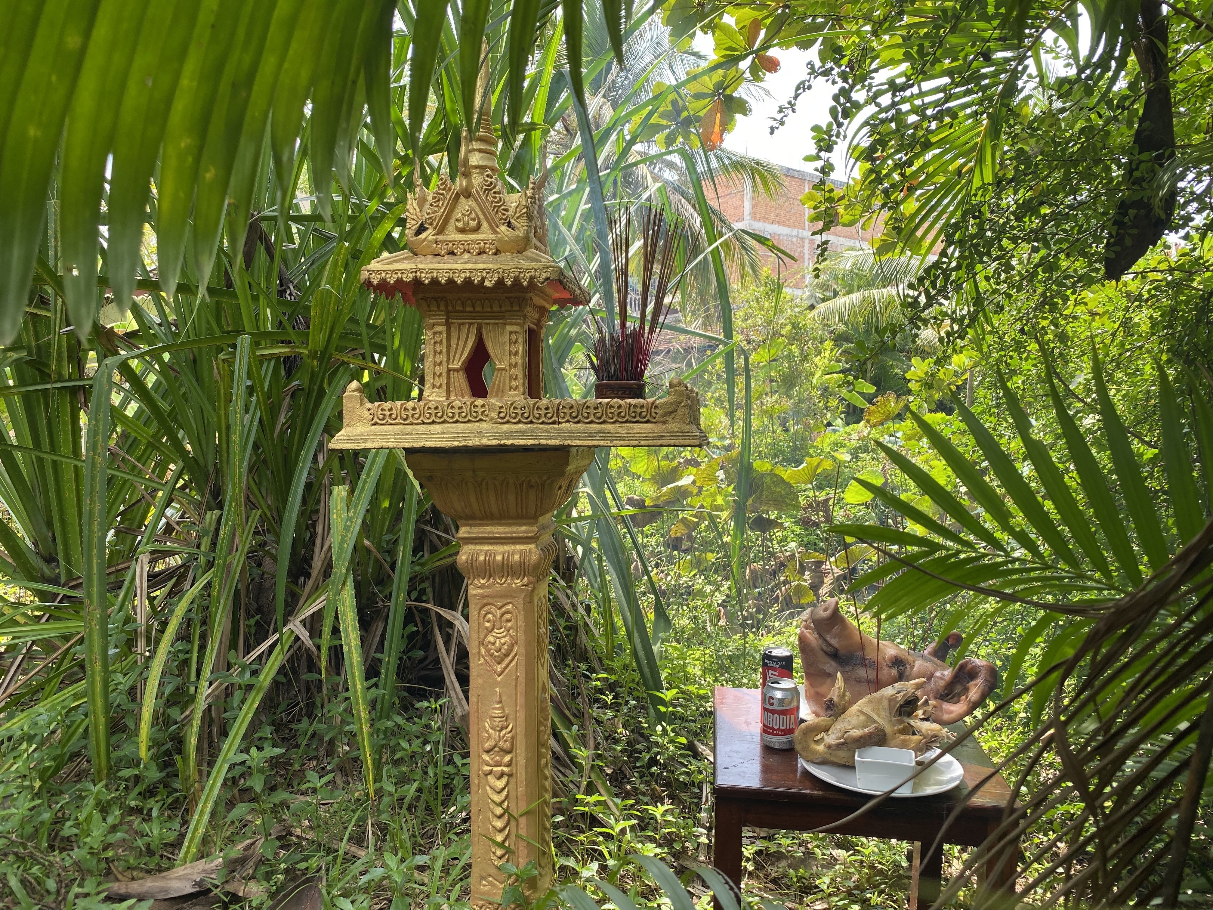 9月。カンボジアではお盆、日本では重陽の節句の季節に、ホテルの土地の精霊様に豚の頭と鶏をお供えして、新たな始まりへのお祈りを。