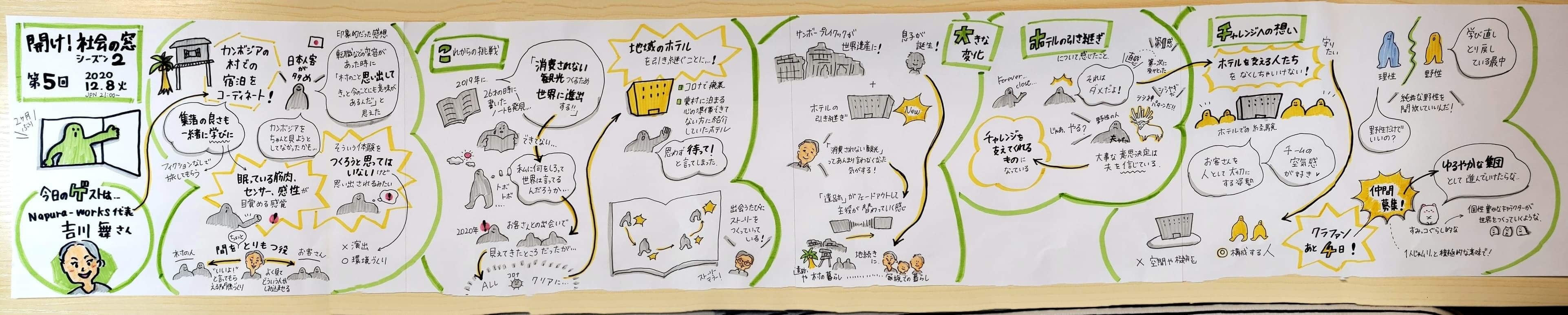 私たちが口から出した言葉、そこにのる空気、その背景が、グラレコニストさんたちというフィルターを通じて、整理され、別の形になって顕れる。これってすごいライブであり、即興であり、すんごく私たちが好きな旅に近い。この発見はとってもうれしい。